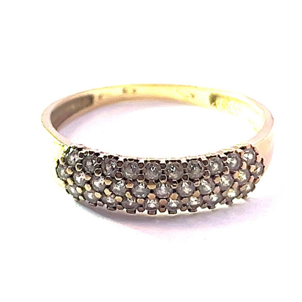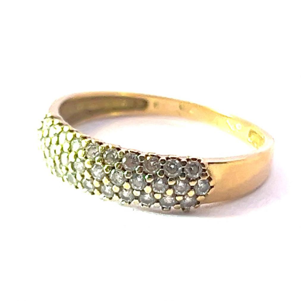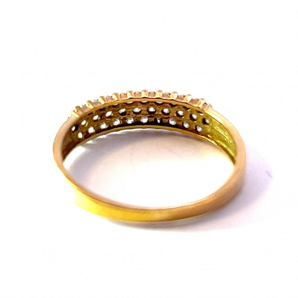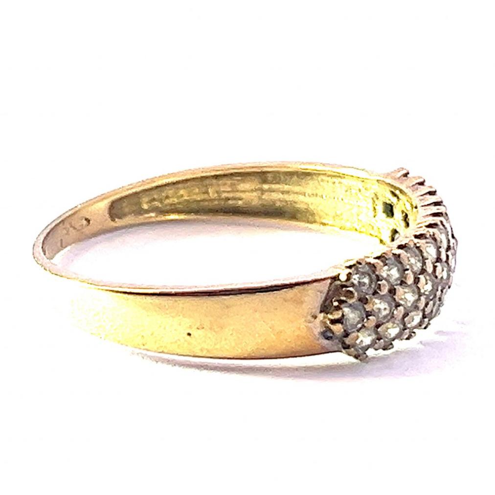 Elegantní zlatý prsten osázený zirkony. Zlato o ryzosti 585/1000 s puncem labuť. Velikost 54, váha 1,56 g. V nejširším bodě 4 mm. Průměr zirkonů je 1 mm. Kameny jsou syntetické.
