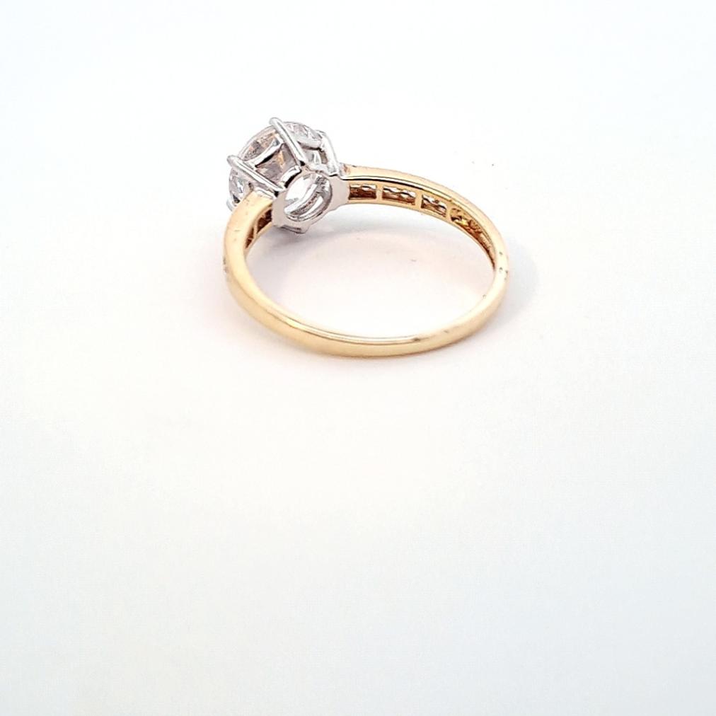Zlatý prsten o ryzosti 375/1000, platná značka konvence. Velikost 54, váha 2,15 g, průměr kamene 9 mm. Kameny jsou syntetické.