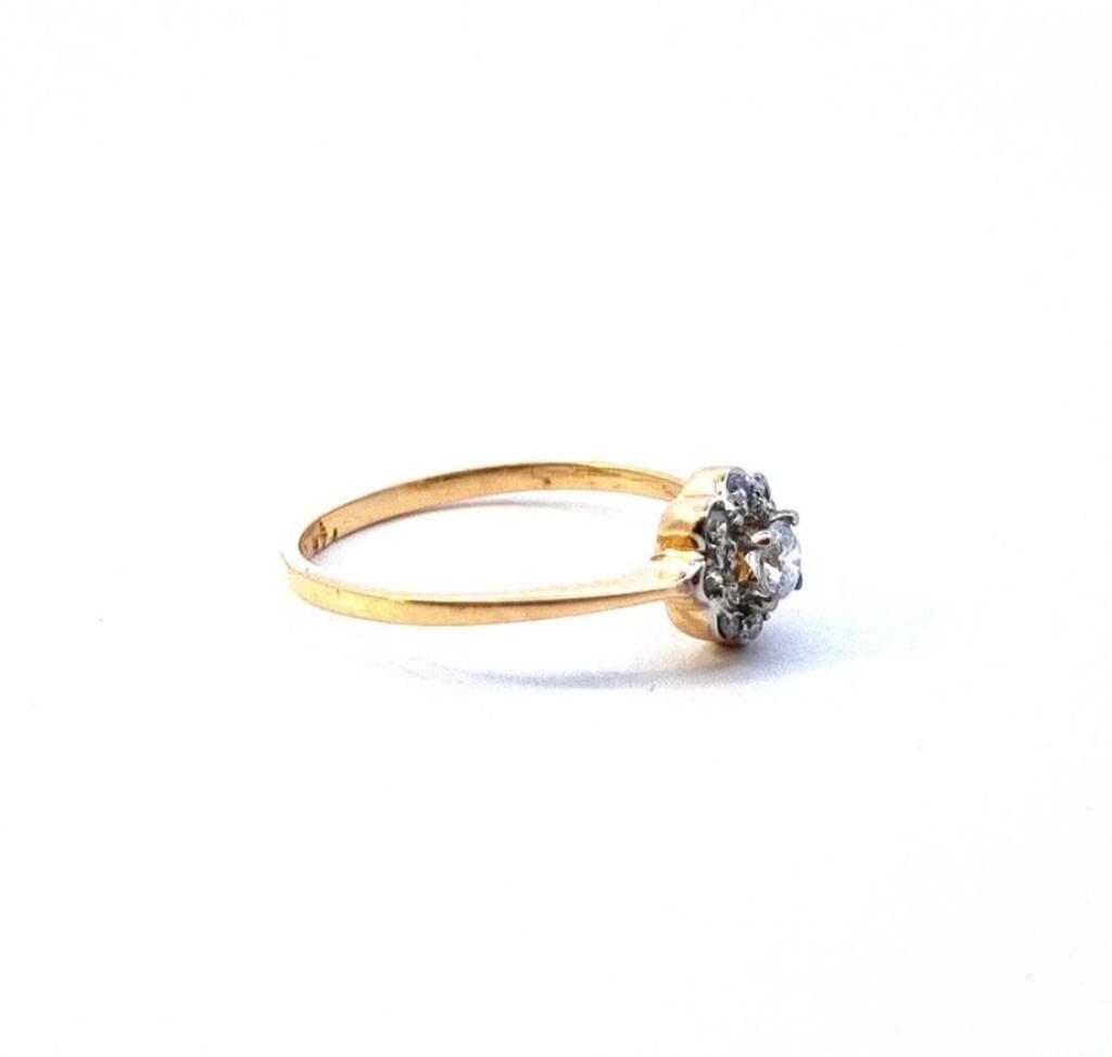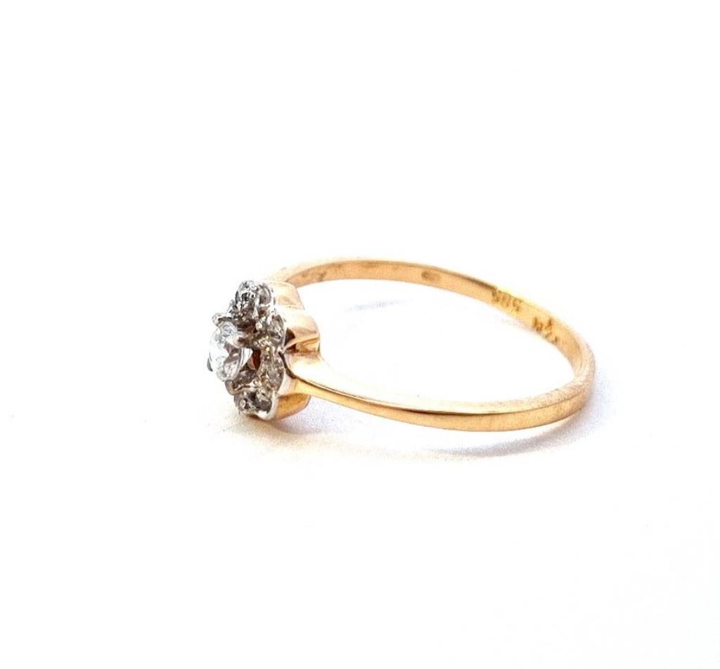Zlatý prsten o ryzosti 585/1000, punc labuť. Velikost 55, váha 1,97 g, šířka v nejširším bodě 8 mm.