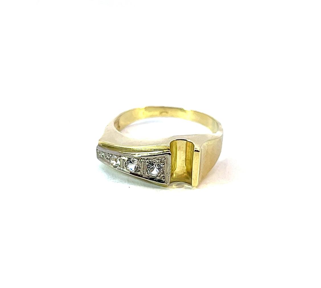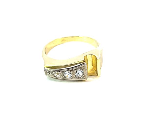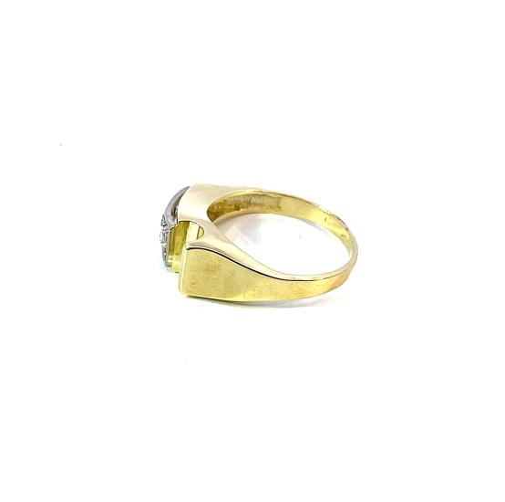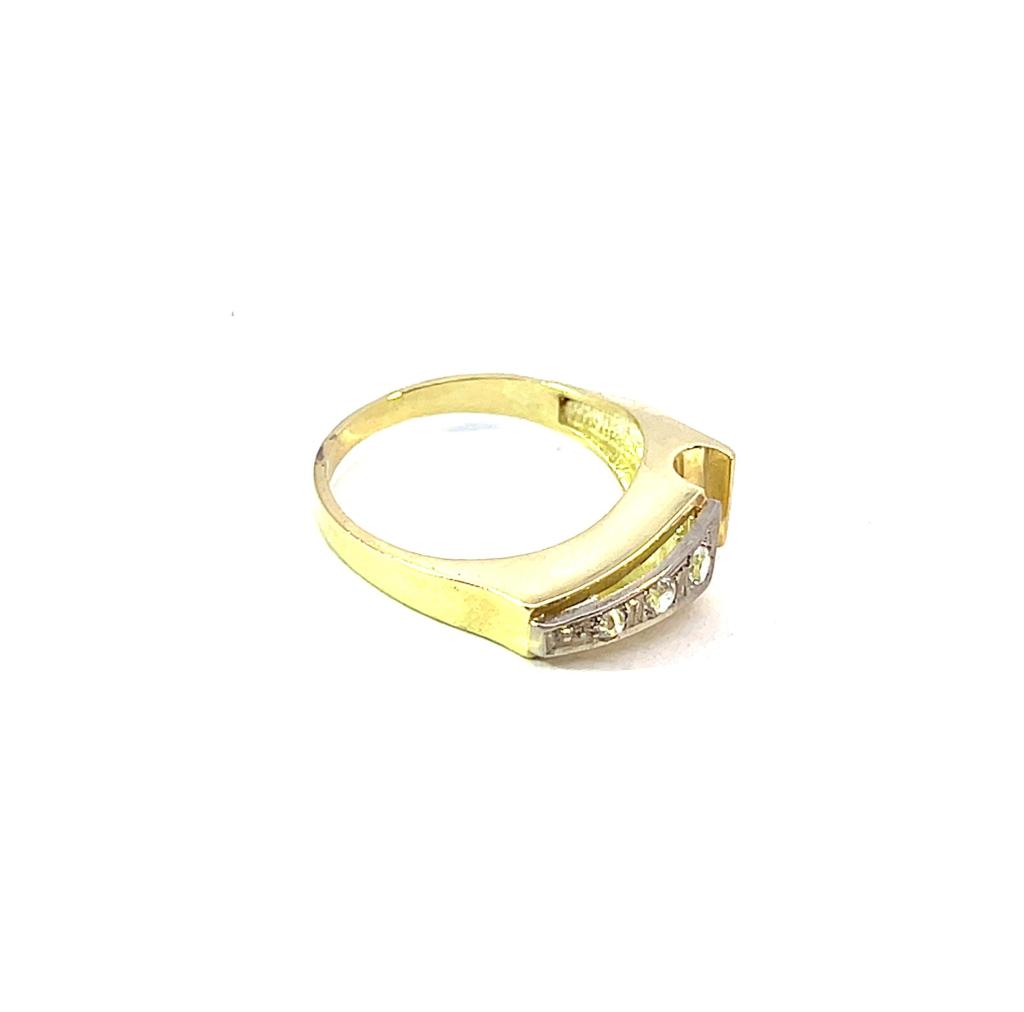 Prsten z kombinace žlutého a bílého zlata o ryzosti 585/1000, punc čejka. Váha 3,81 g, velikost 55, v nejširším bodě 8 mm. Kameny jsou syntetické.
