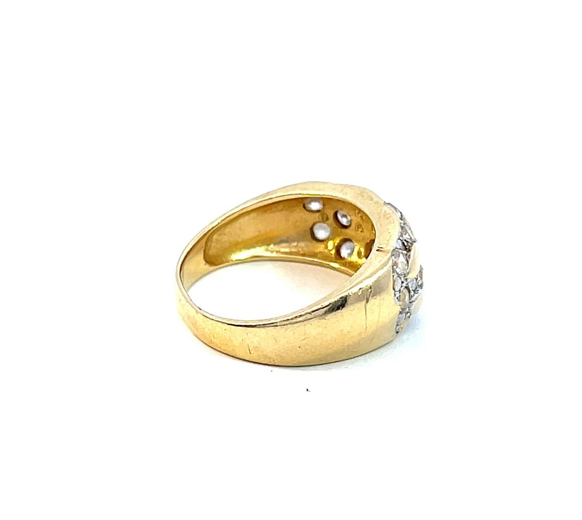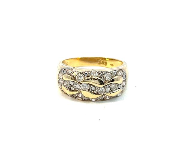 Prsten z kombinace žlutého a bílého zlata o ryzosti 585/1000, punc labuť. Váha 5,22 g, velikost 56, v nejširším bodě 9 mm.