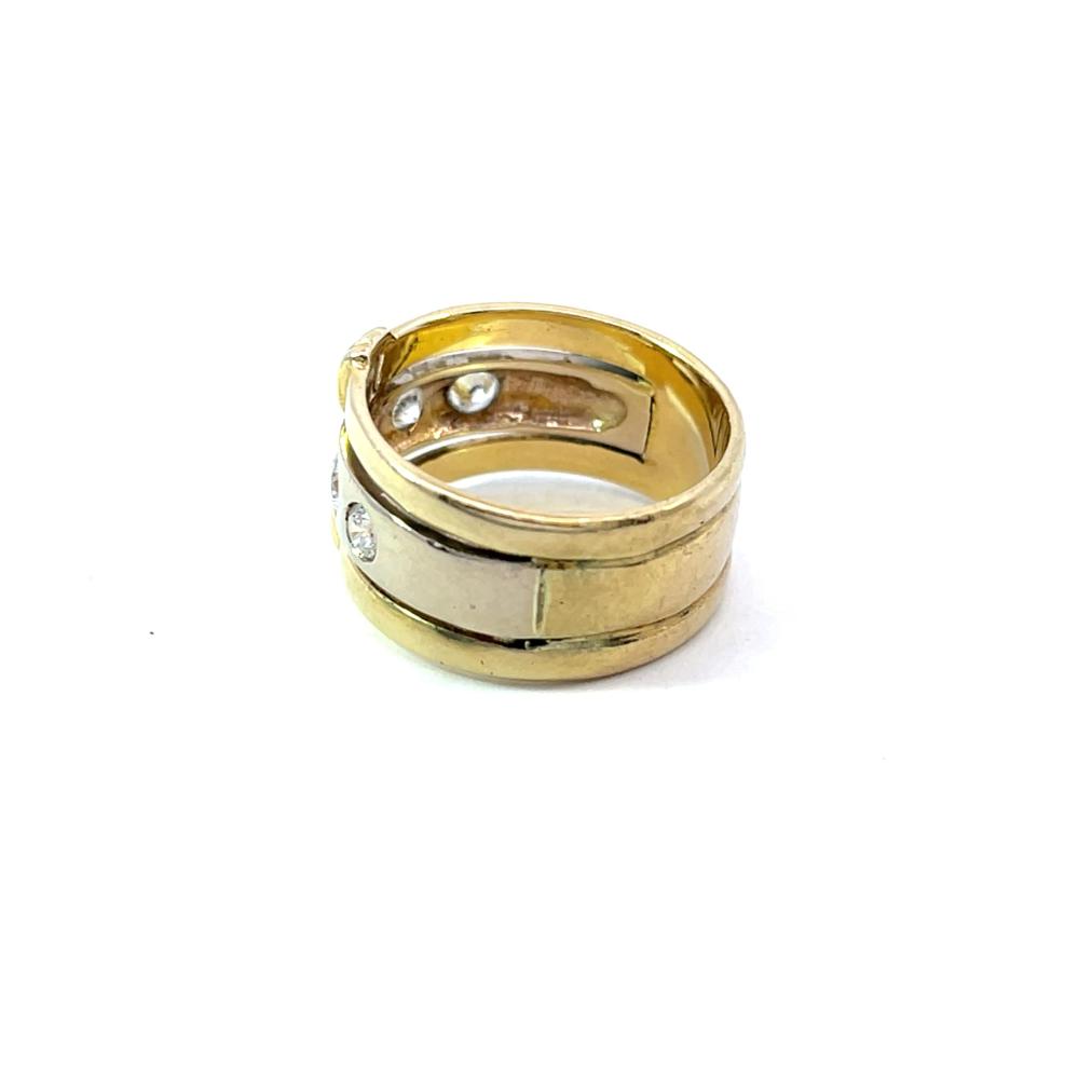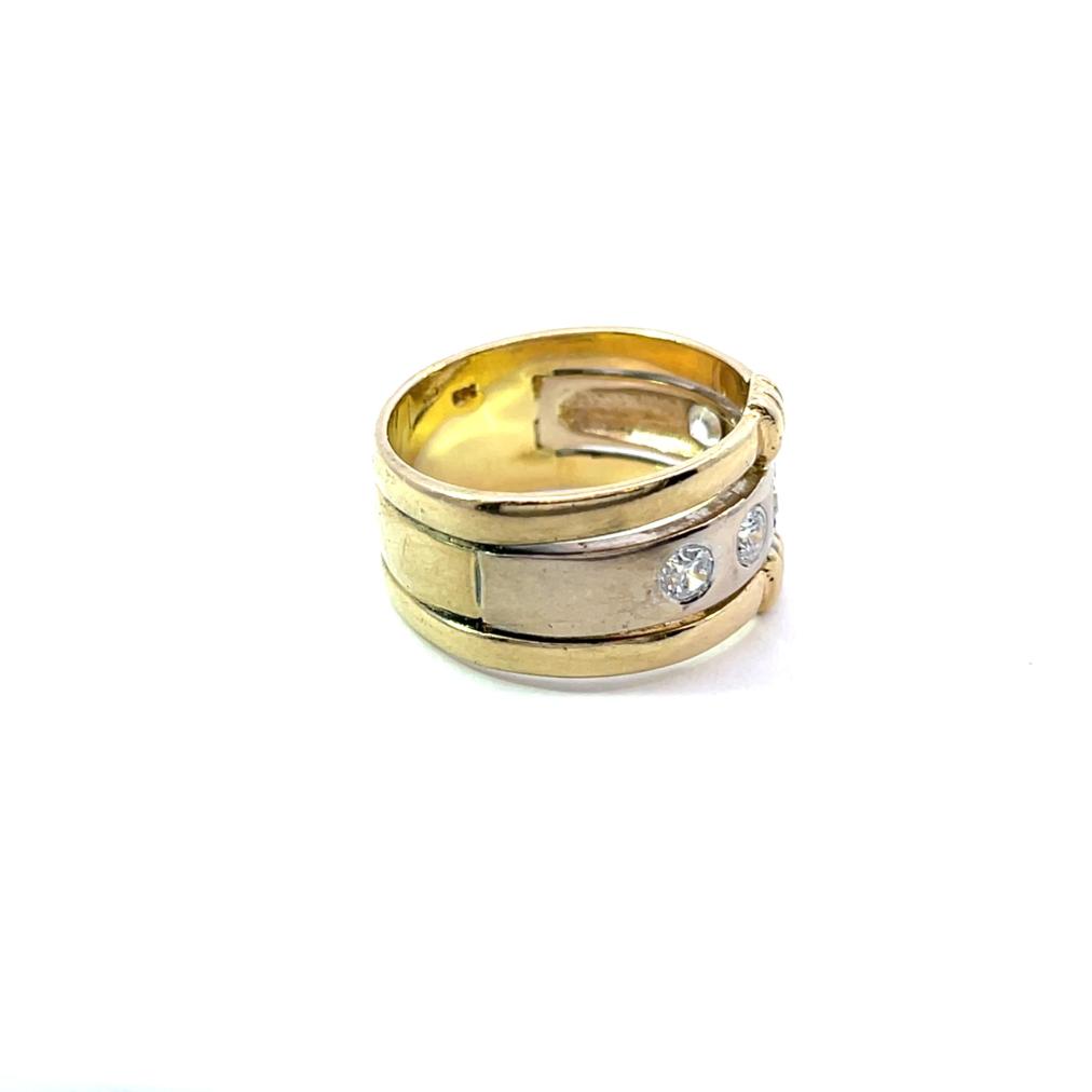 Prsten z kombinace žlutého a bílého zlata o ryzosti 585/1000, punc labuť. Velikost 56, váha 7,61 g, v nejširším bodě 13 mm. Kameny jsou syntetické.