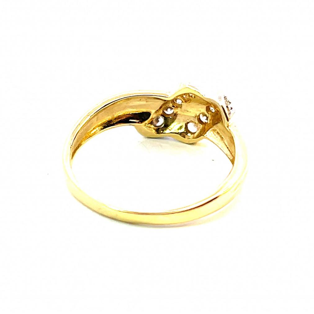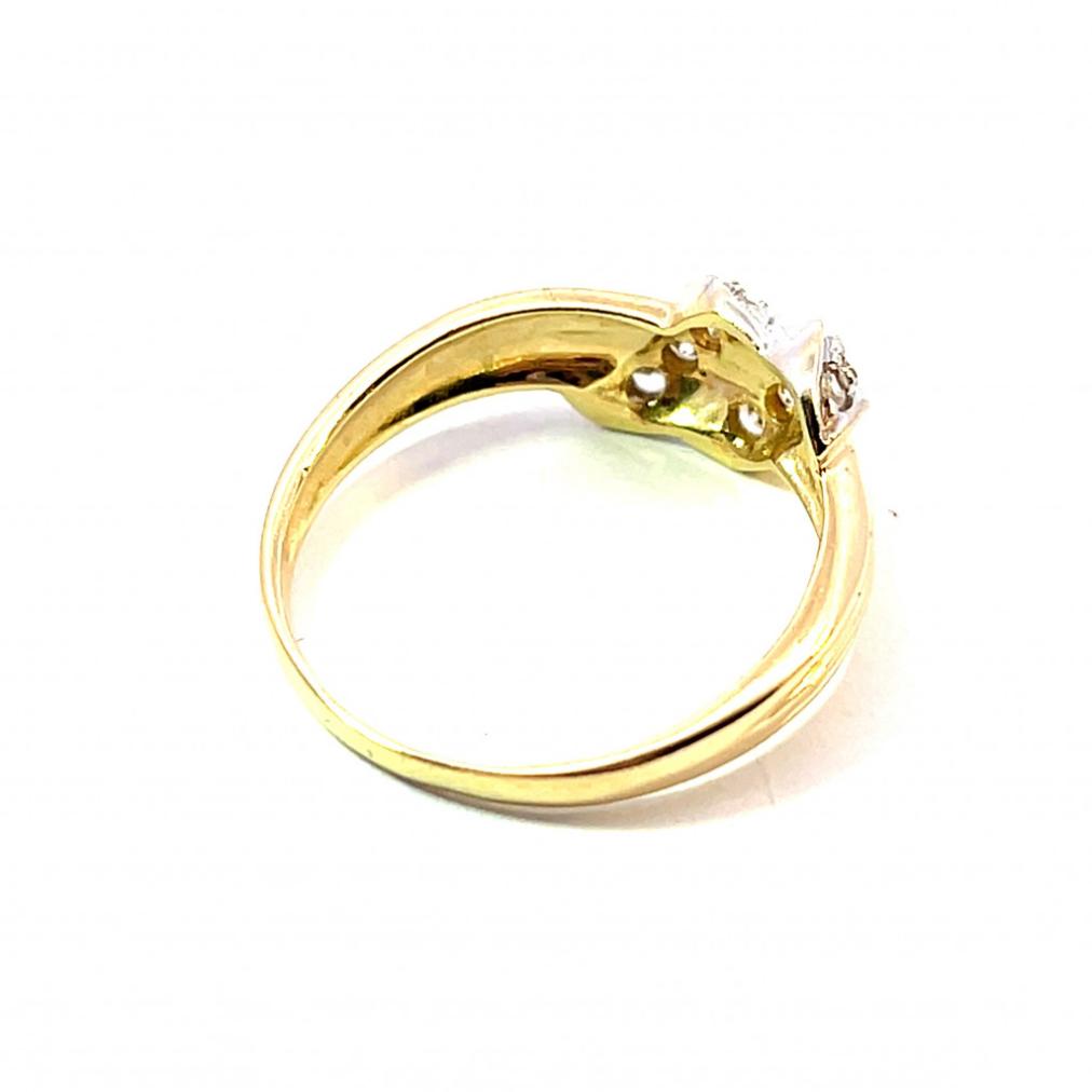Prsten z kombinace žlutého a bílého zlata o ryzosti 585/1000, punc labuť. Velikost 57,5, váha 3,30 g, v nejširším bodě 9 mm.