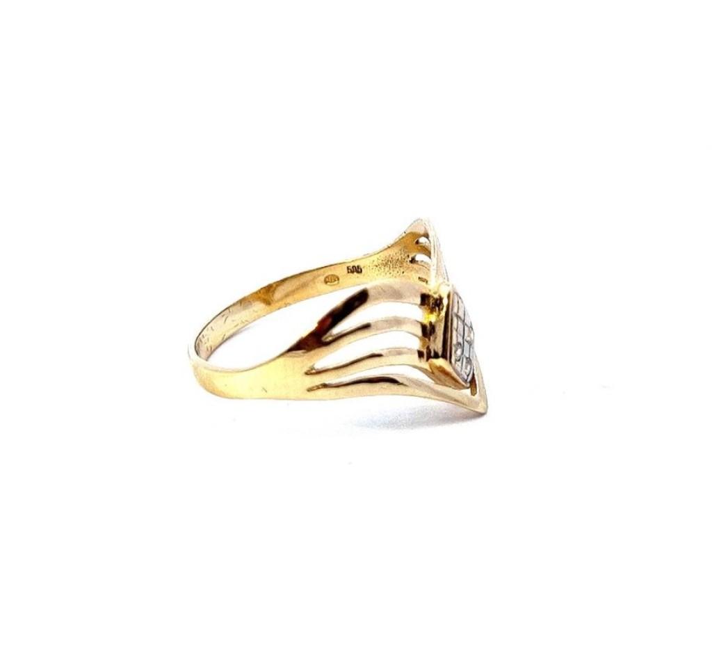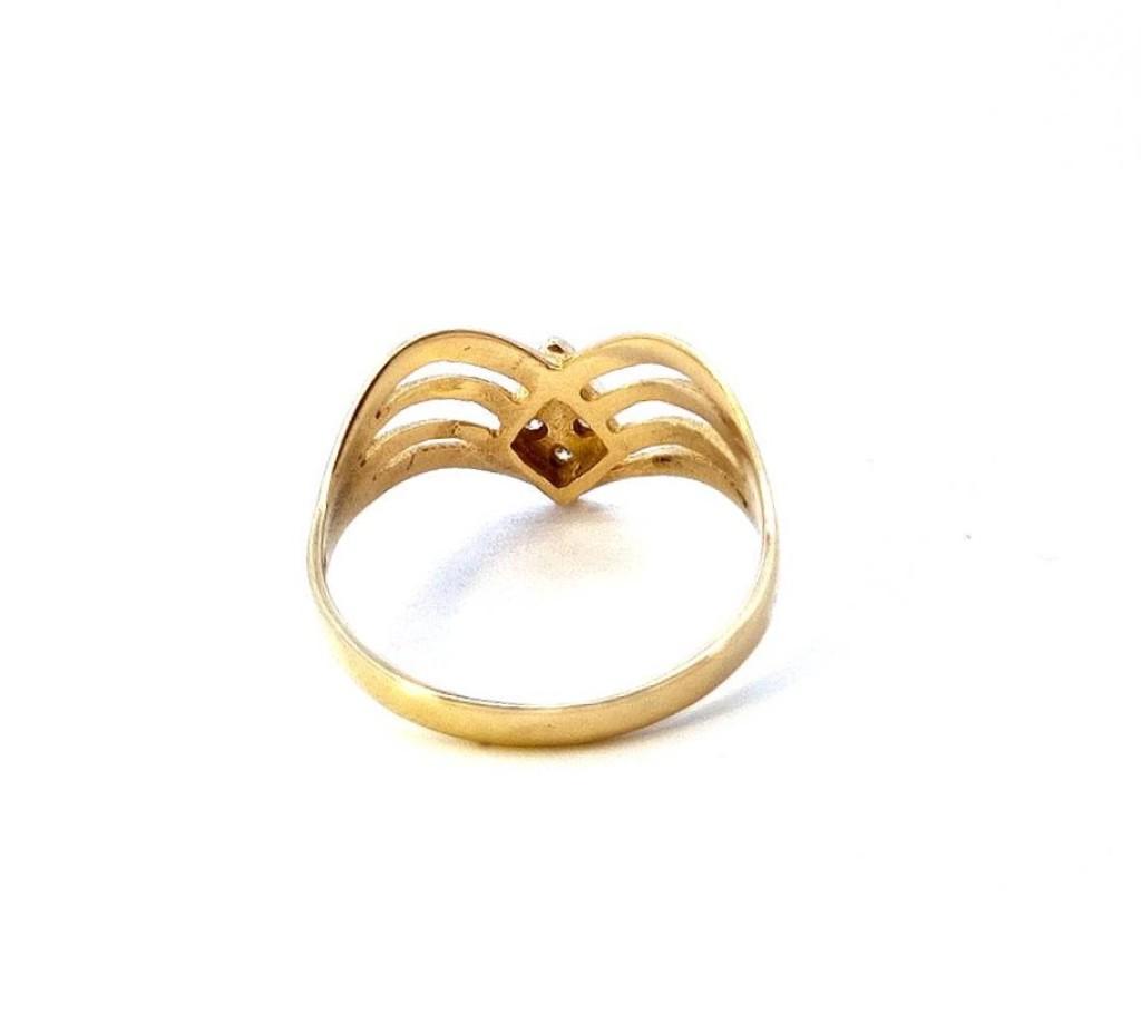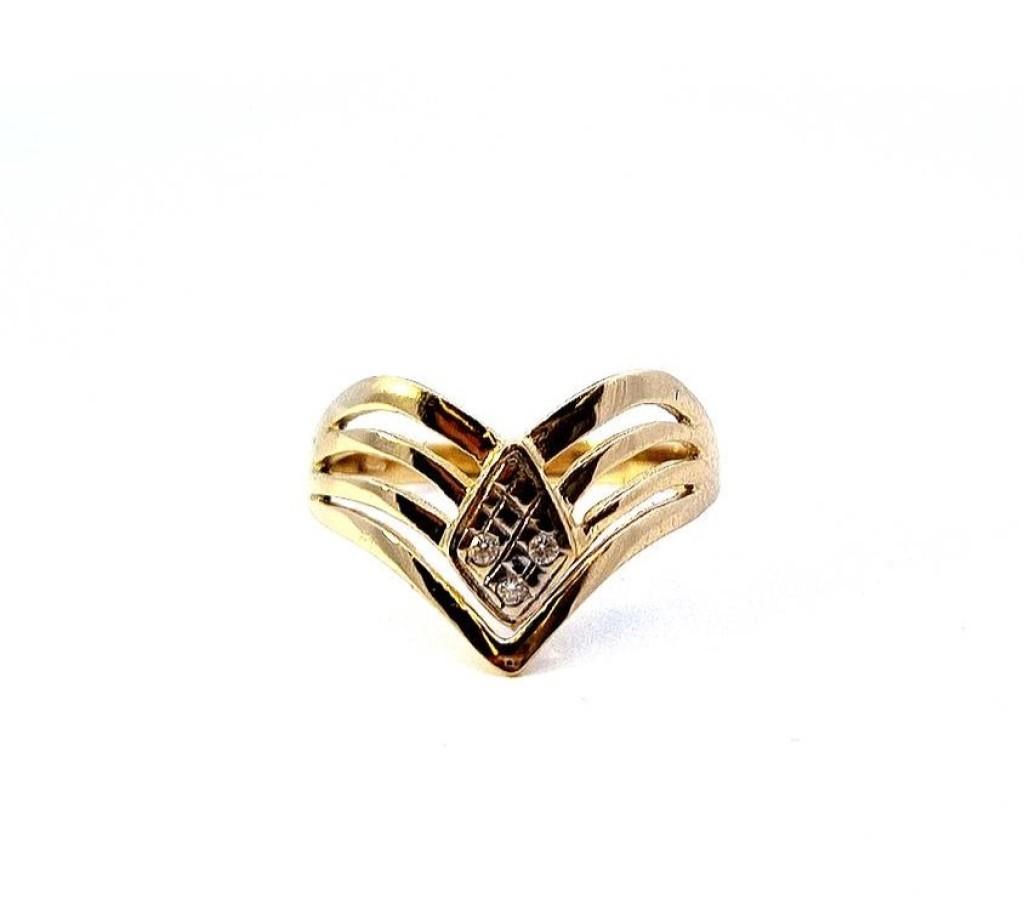 Zlatý prsten o ryzosti 585/1000, punc labuť. Velikost 58, váha 2,47 g, v nejširším bodě 14 mm.