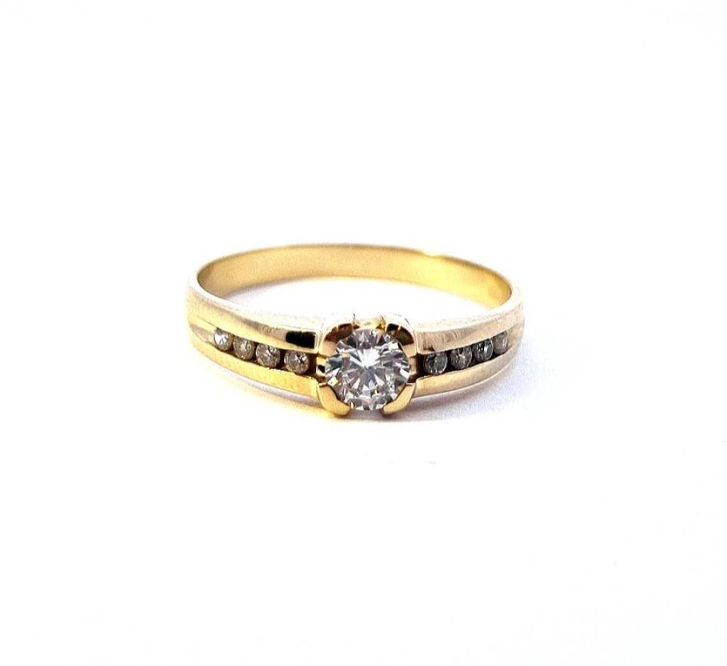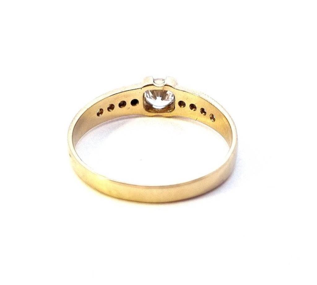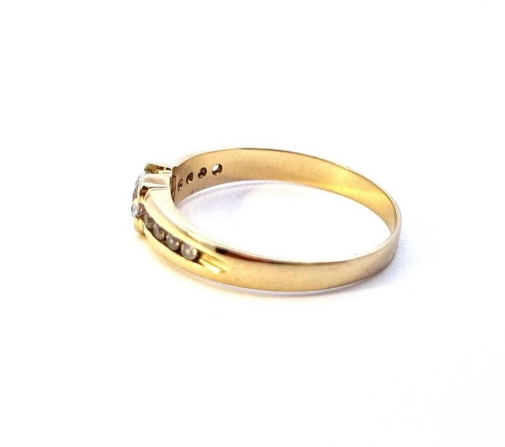 Zlatý prsten o ryzosti 585/1000, punc labuť. Velikost 58, váha 2,33 g, v nejširším bodě 5 mm.