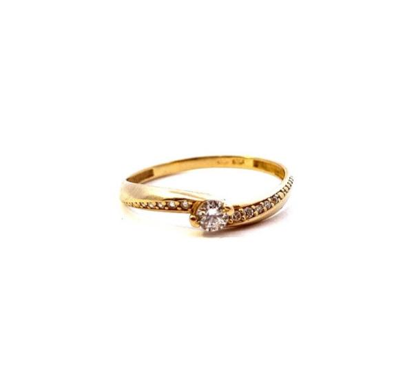Zlatý prsten o ryzosti 585/1000, punc labuť. Velikost 58, váha 1,56 g, v nejširším bodě 3 mm.
