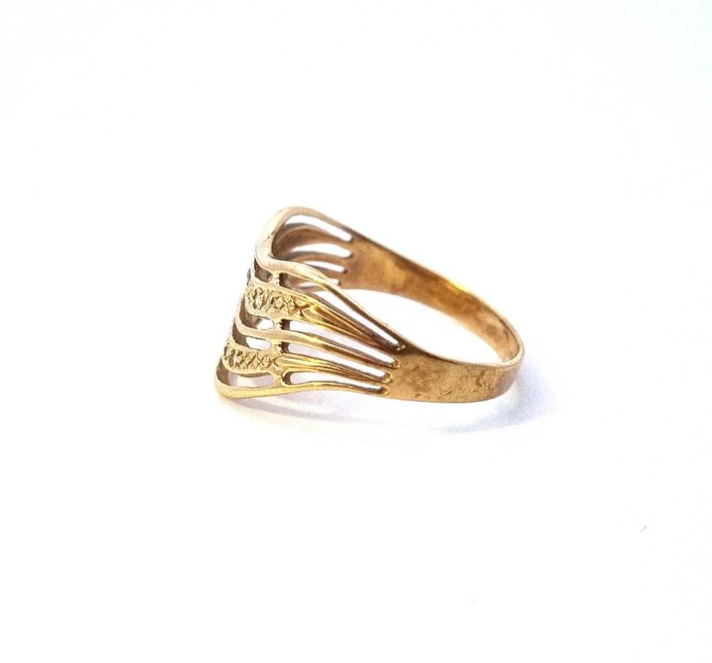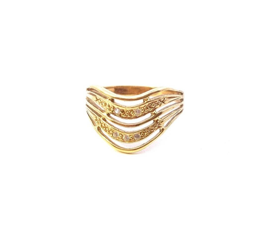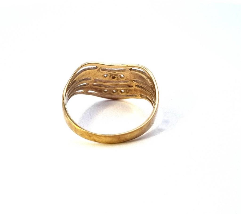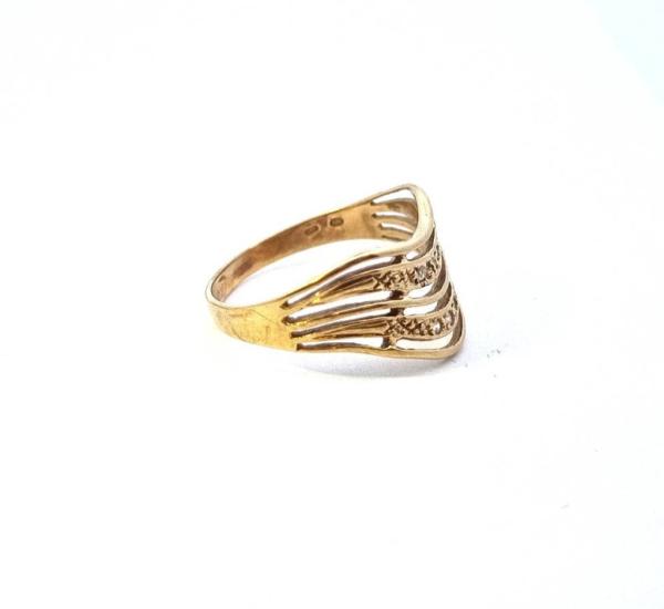 Zlatý prsten se zirkony, vel. 58. Ryzost 585/1000, punc labuť. Váha 3,02 g, v nejširším bodě 11 mm.