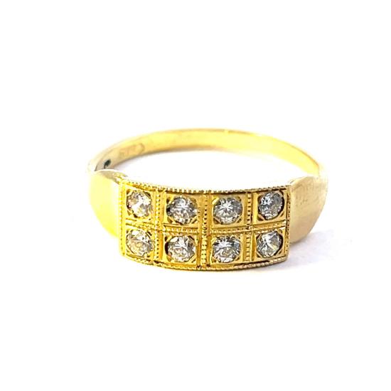 Zlatý prsten zdobený zirkony. Ryzost 585/1000 s puncem labuť. Váha 3,34 g, velikost 62. V nejširším bodě měří 7 mm, šířka obroučky 2 mm. Kameny jsou syntetické.
