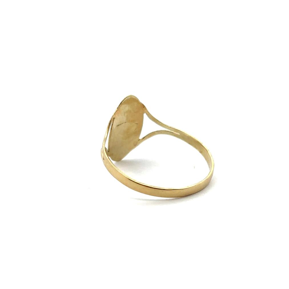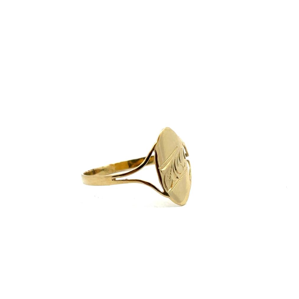 Zlatý prsten o ryzosti 585/1000, punc čejka. Velikost 61, váha 1,33 g, rozměr hlavy prstenu 14,5 x 8 mm.