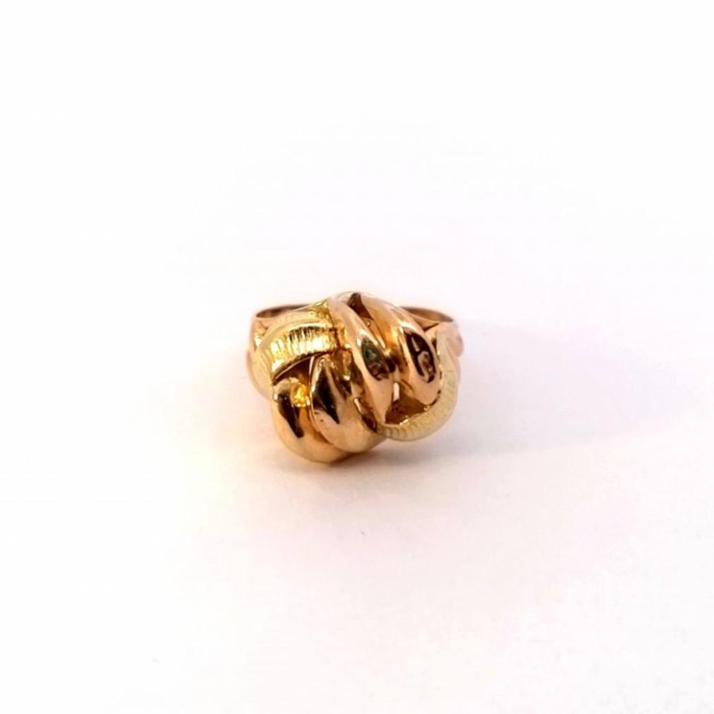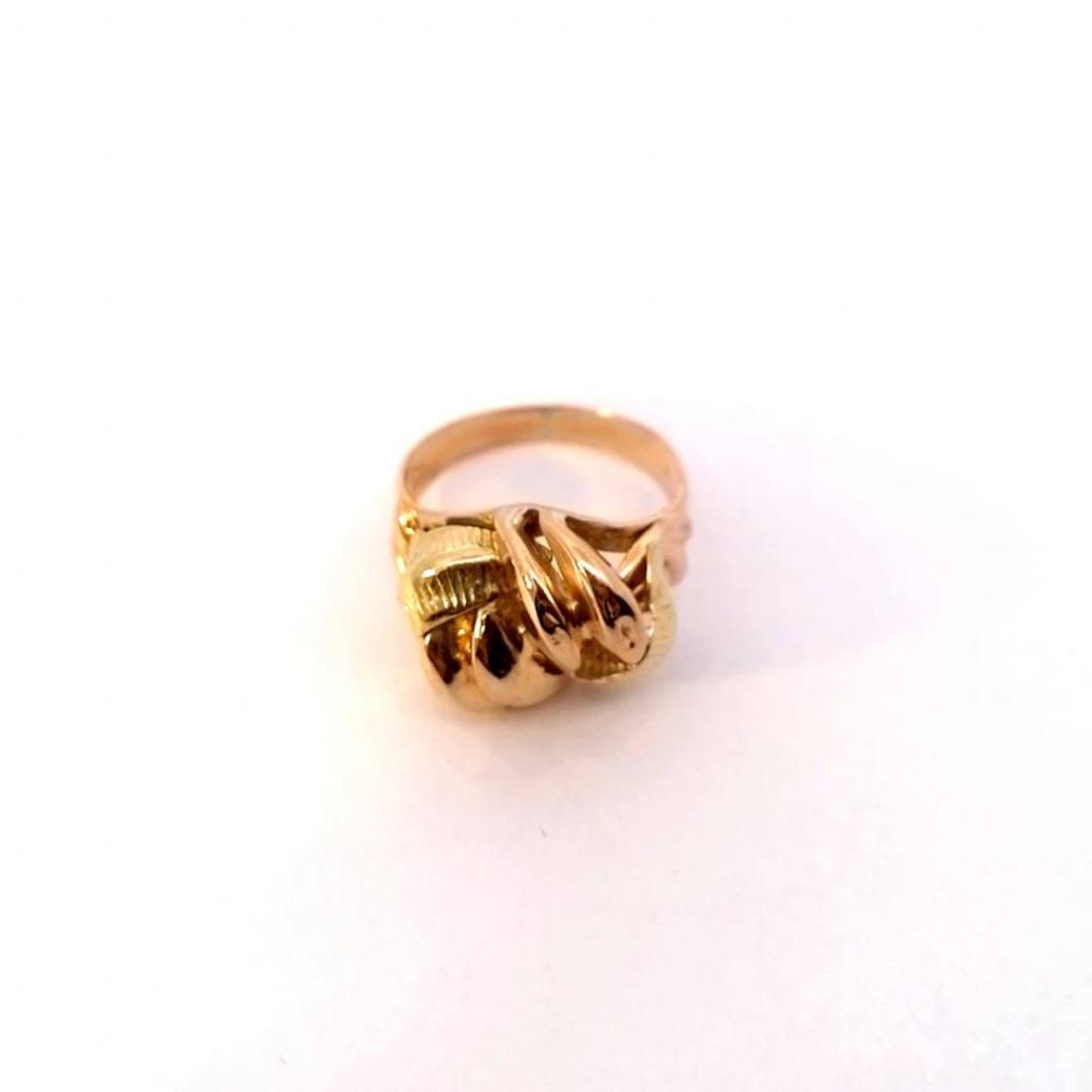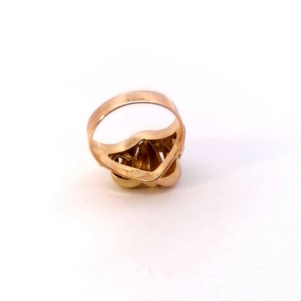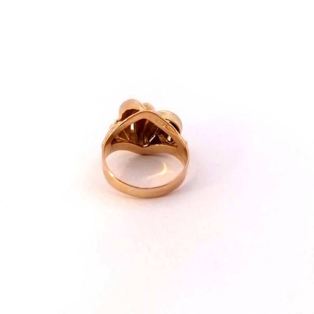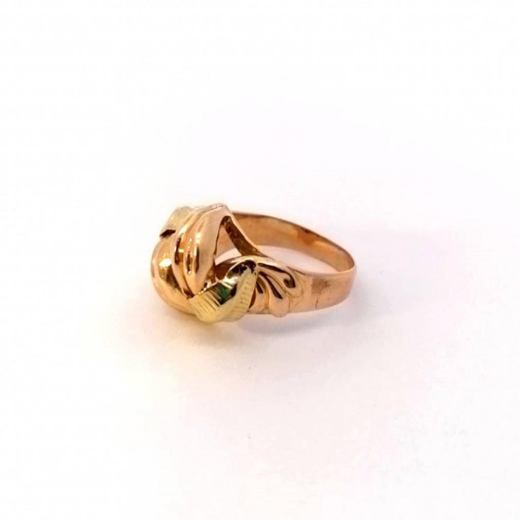 Prsten z kombinace žlutého a růžového zlata o ryzosti 750/1000, punc kohout. Velikost 52, váha 4,70 g, v nejširším bodě 13 mm.