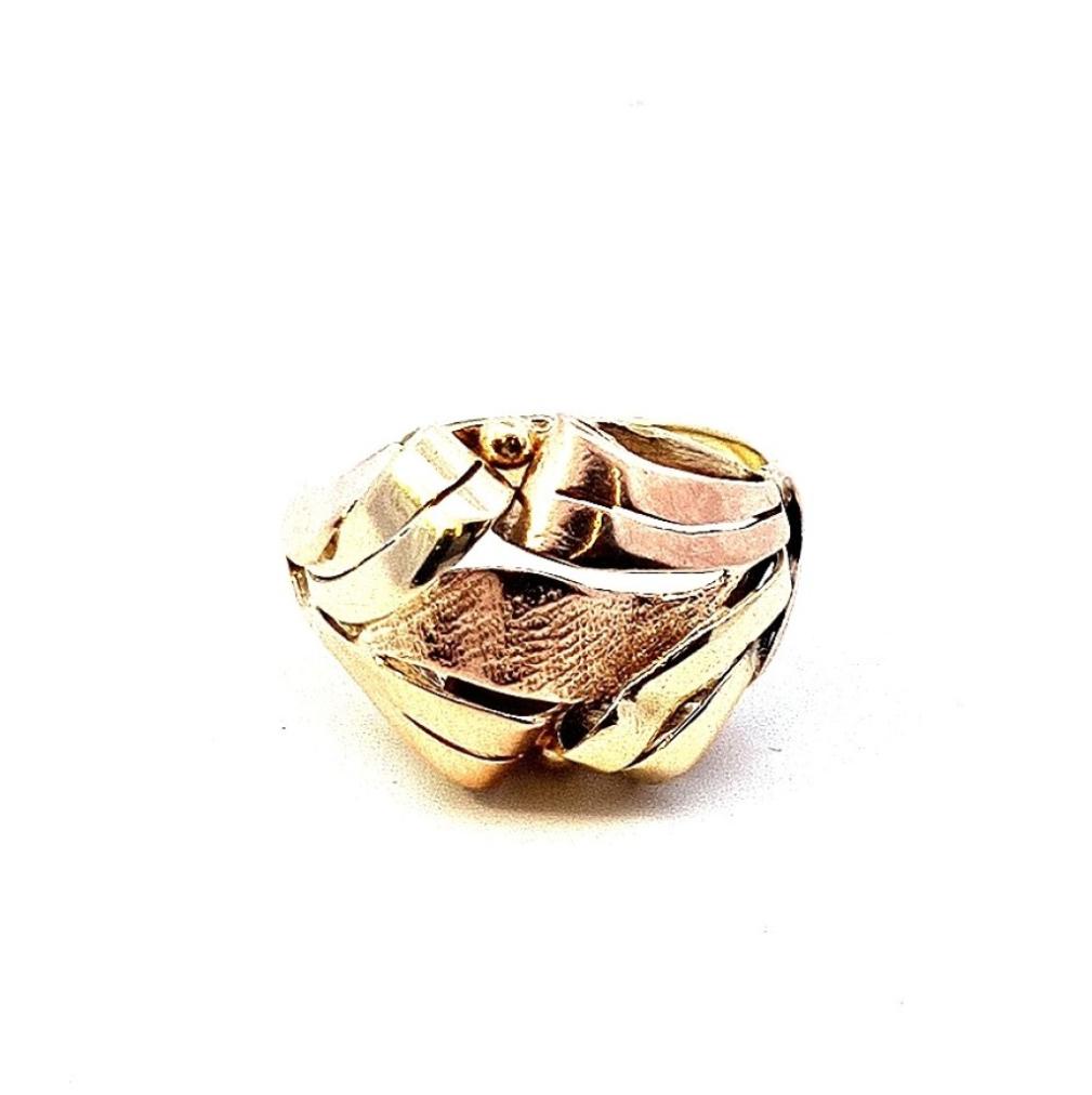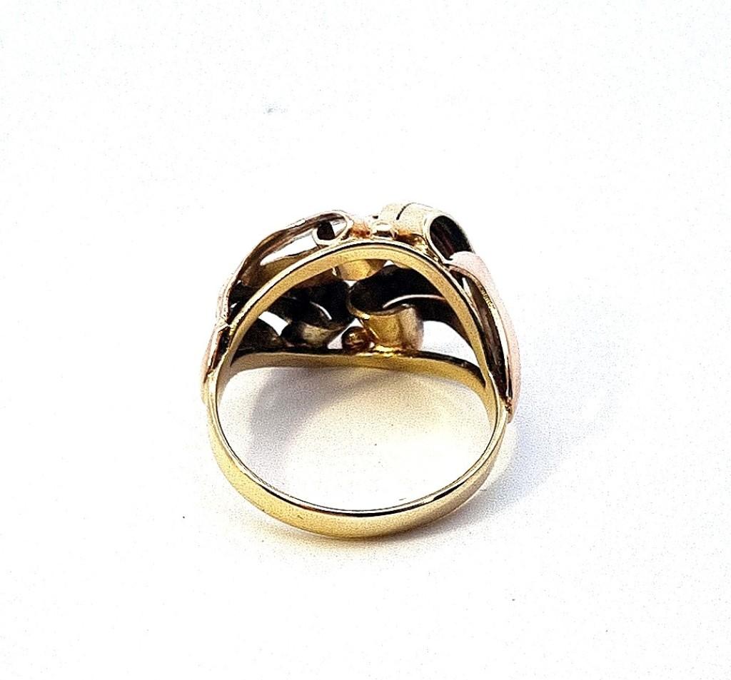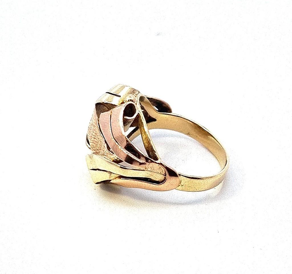 Zlatý prsten o ryzosti 585/1000, punc labuť , váha 4,59 g, velikost 52, v nejširším bodě 14 mm.