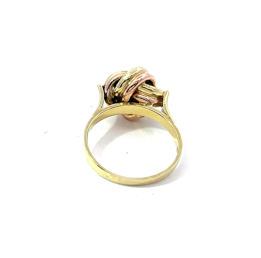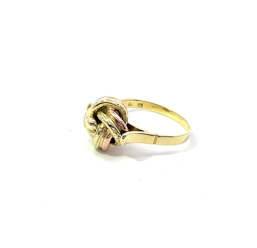 Prsten z kombinace žlutého a růžového zlata o ryzosti 585/1000, punc čejka. Velikost 55, váha 5,10 g, v nejširším bodě 12 mm.