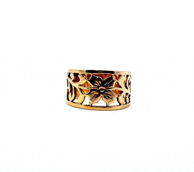 Zlatý prsten o ryzosti 375/1000, platná puncovní značka. Velikost 55,5, váha 3,68 g, v nejširším bodě 11,5 mm.