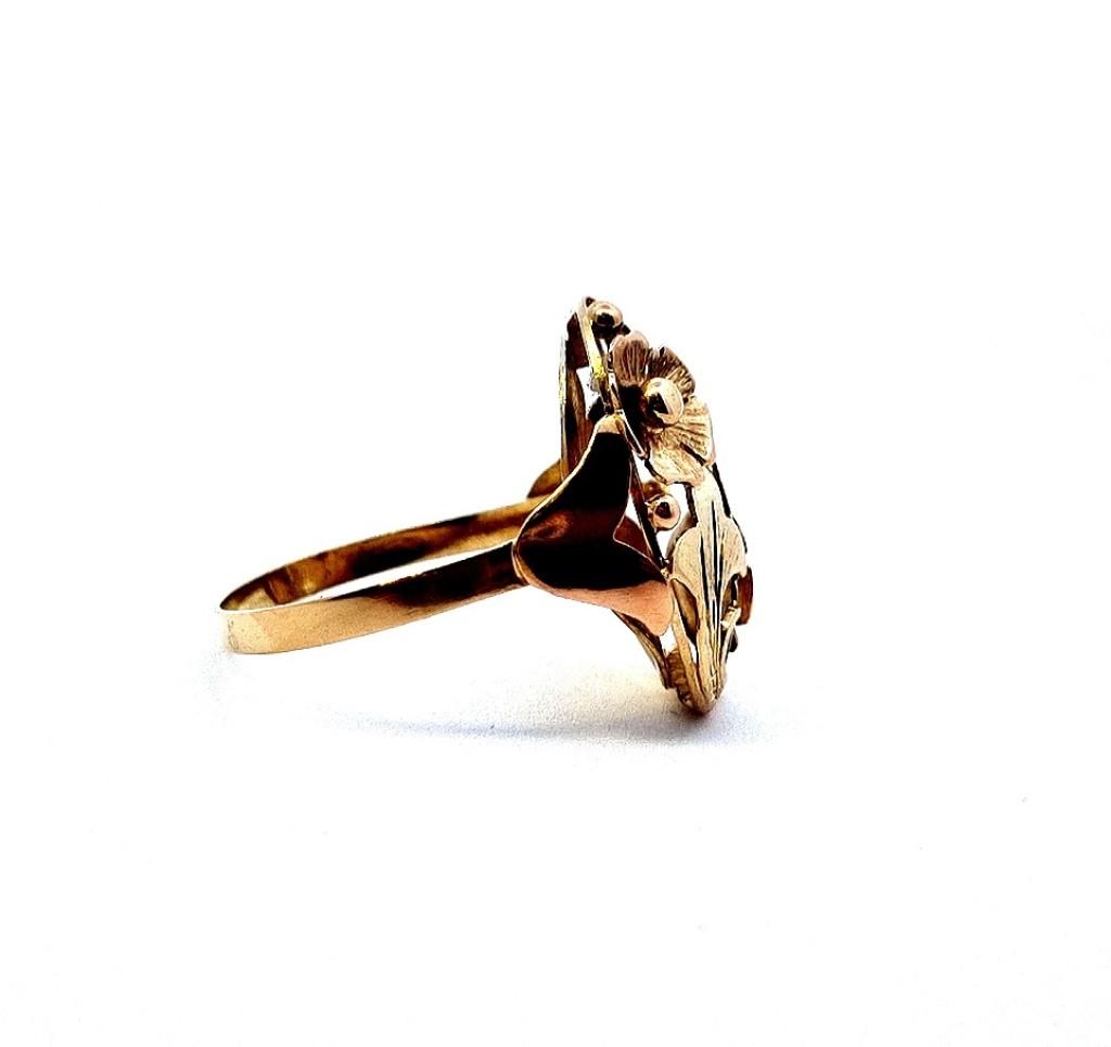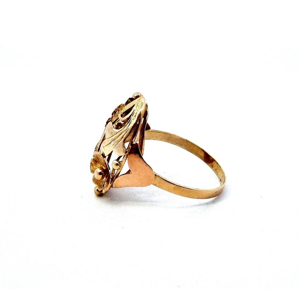 Zlatý prsten o ryzosti 585/1000, punc labuť, váha 3,64 g, velikost 57, v nejširším bodě 21 mm.