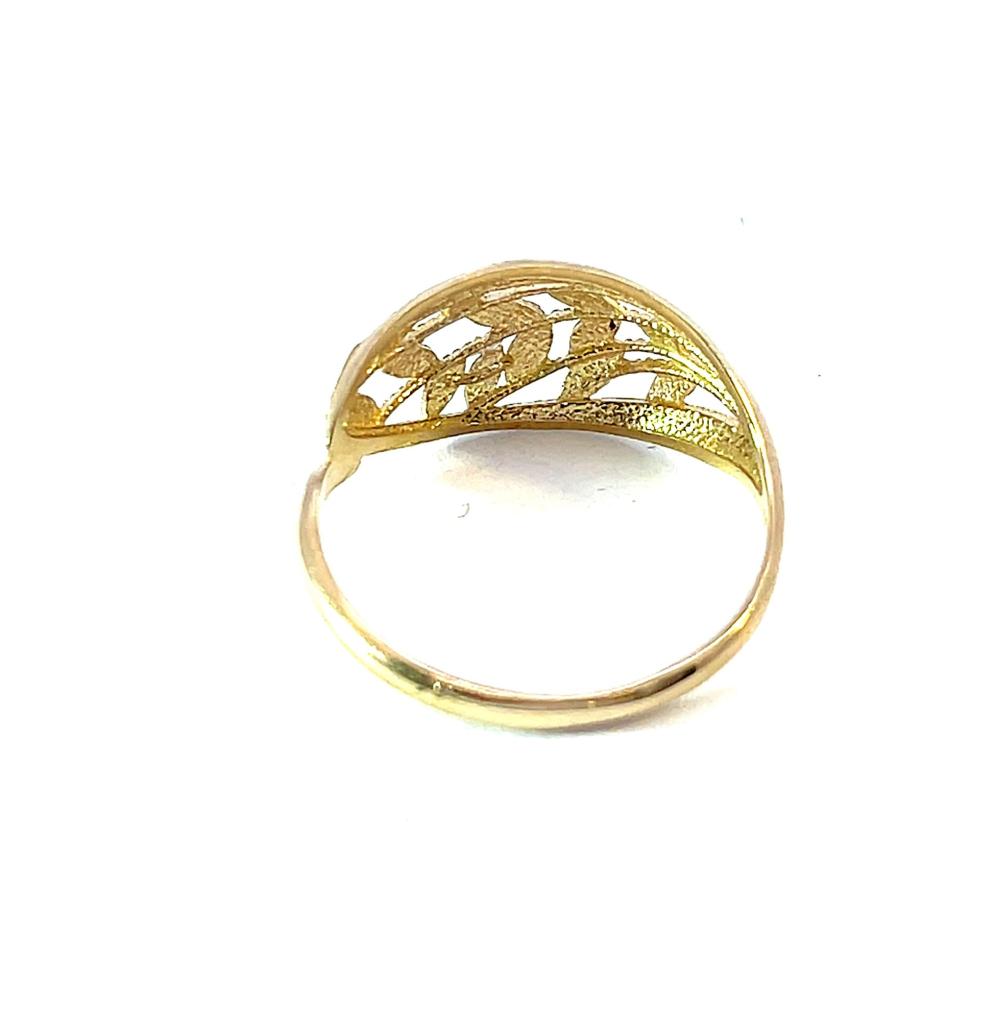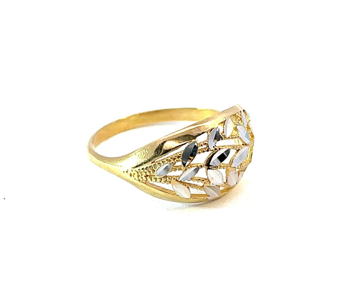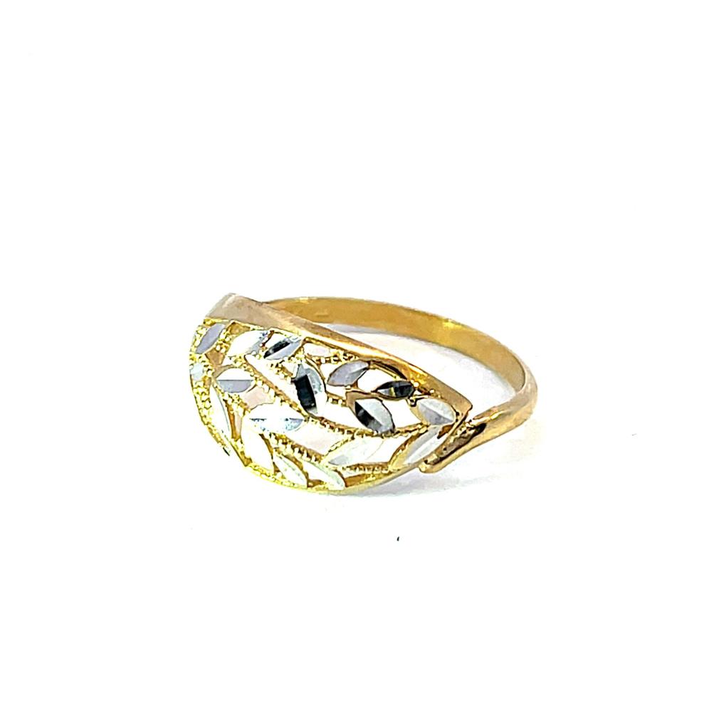 Prsten z kombinace žlutého a bílého zlata o ryzosti 585/1000, punc labuť. Velikost 57,5, váha 1,92 g, v nejširším bodě 10,5 mm.