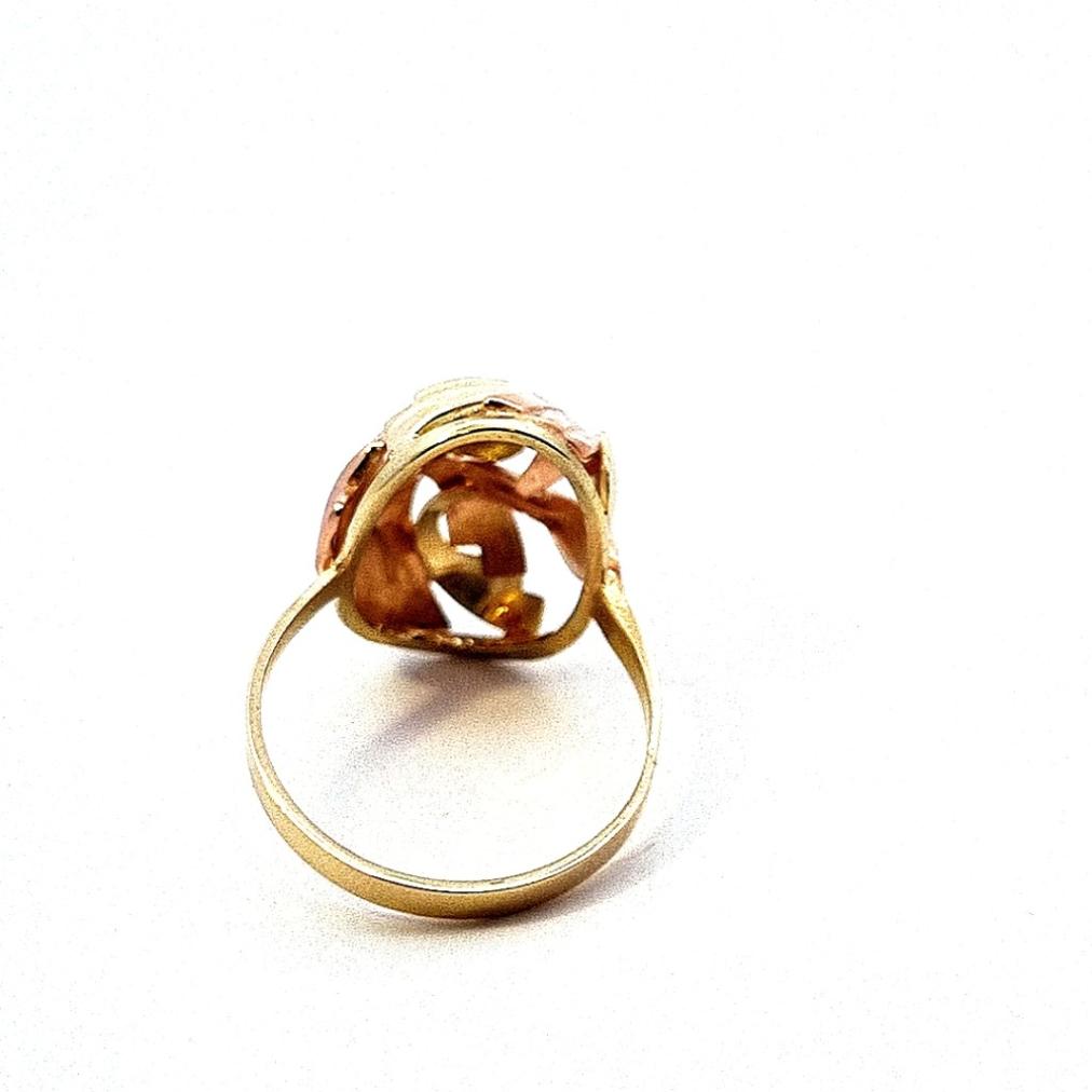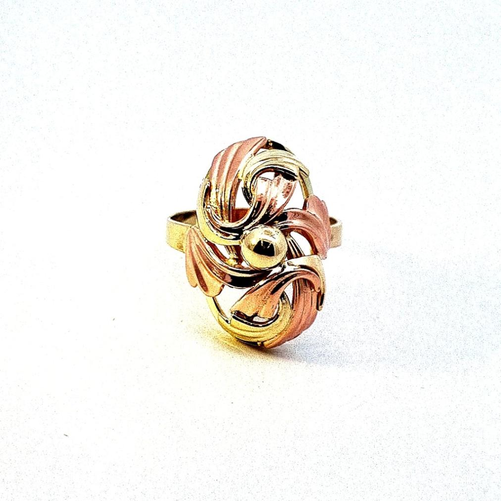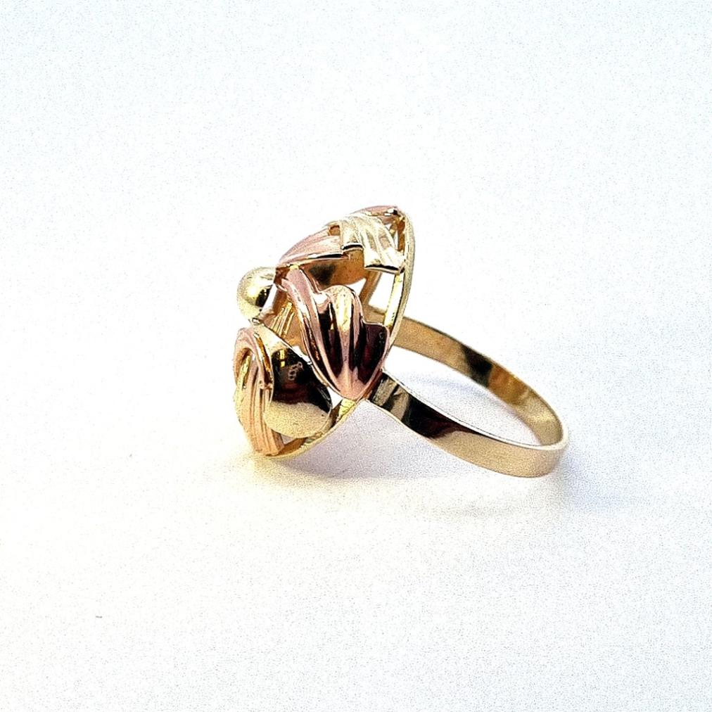 Zlatý prsten o ryzosti 585/1000, punc labuť, váha 5,23 g, velikost 58,5, v nejširším bodě 22 mm.