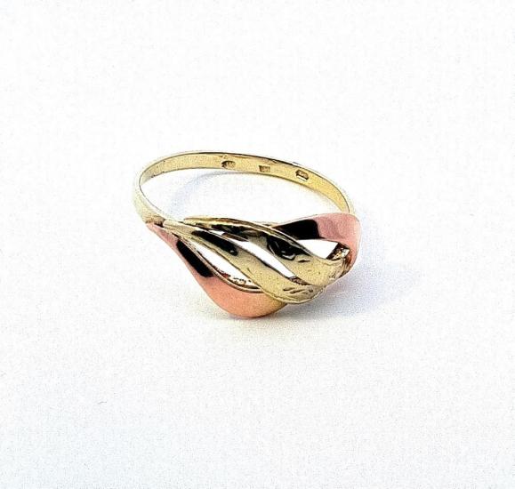 Zlatý prsten o ryzosti 585/1000, punc labuť , váha 1,87 g, velikost 58, v nejširším bodě 9 mm.