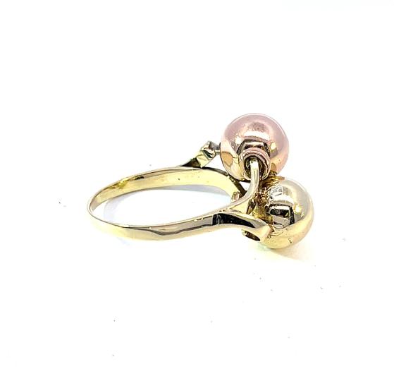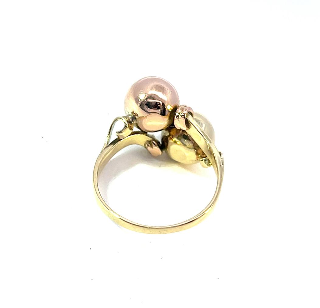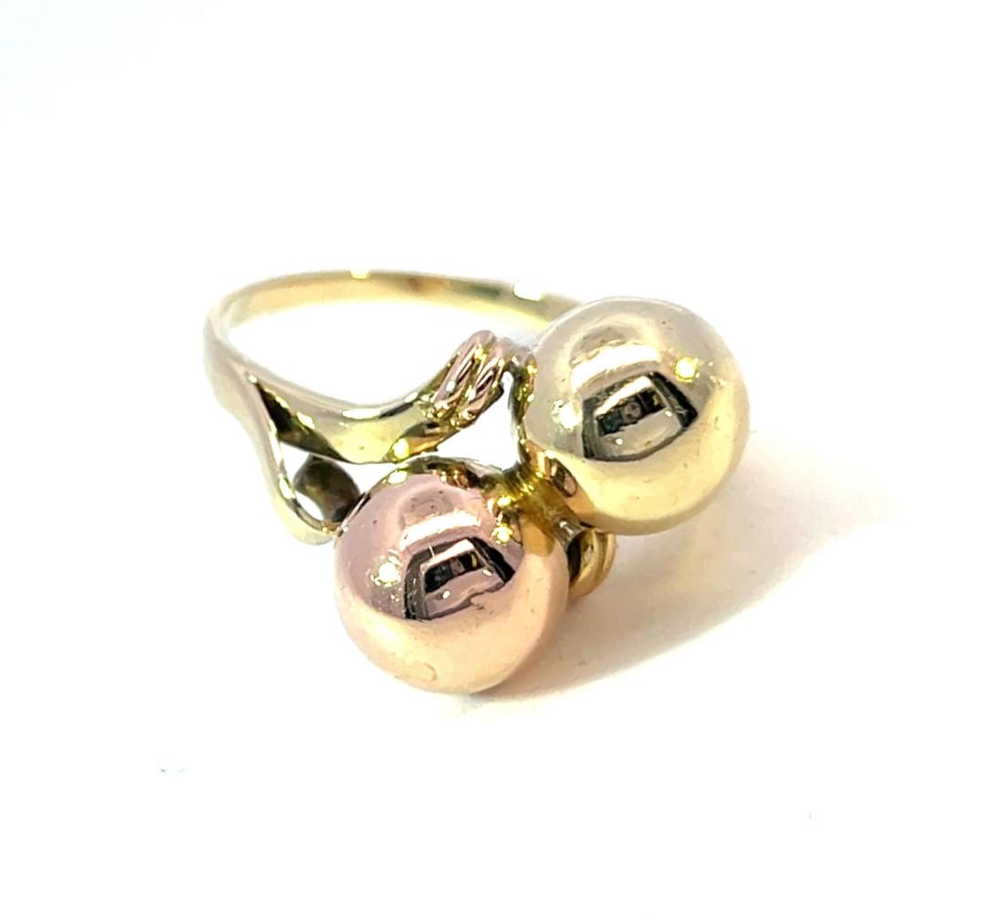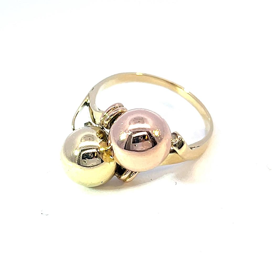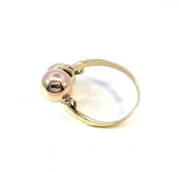 Prsten z kombinace žlutého a růžového zlata o ryzosti 585/1000, punc labuť. Velikost 59, váha 4,72 g, v nejširším bodě 18 mm.