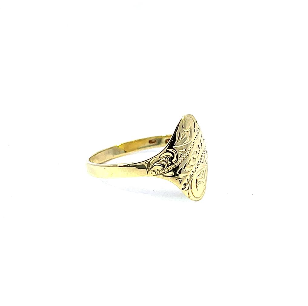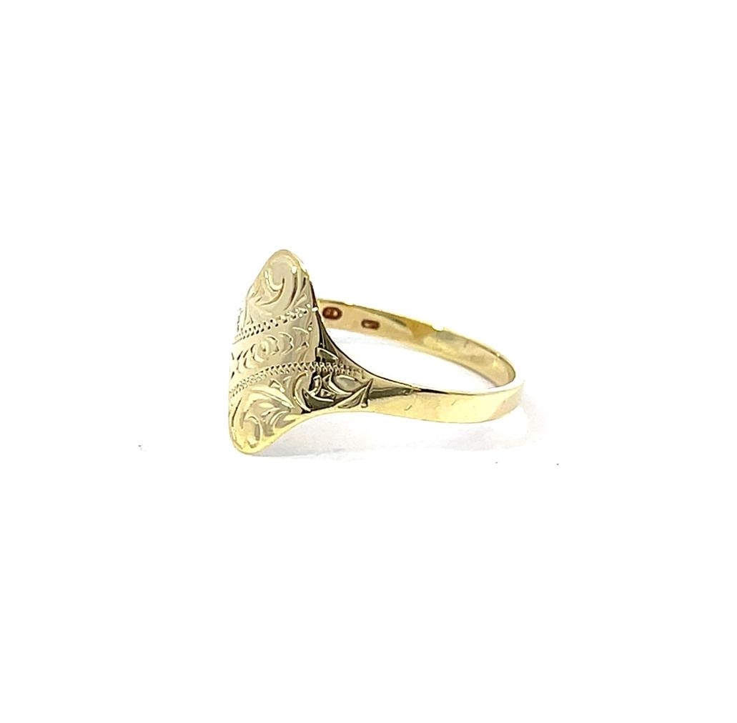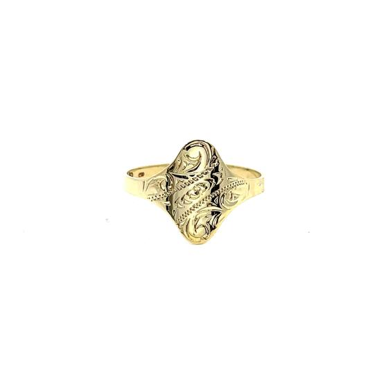 Zlatý prsten o ryzosti 585/1000, punc labuť. Velikost 59, váha 1,64 g, rozměr hlavy prstenu 14 x 13 mm.