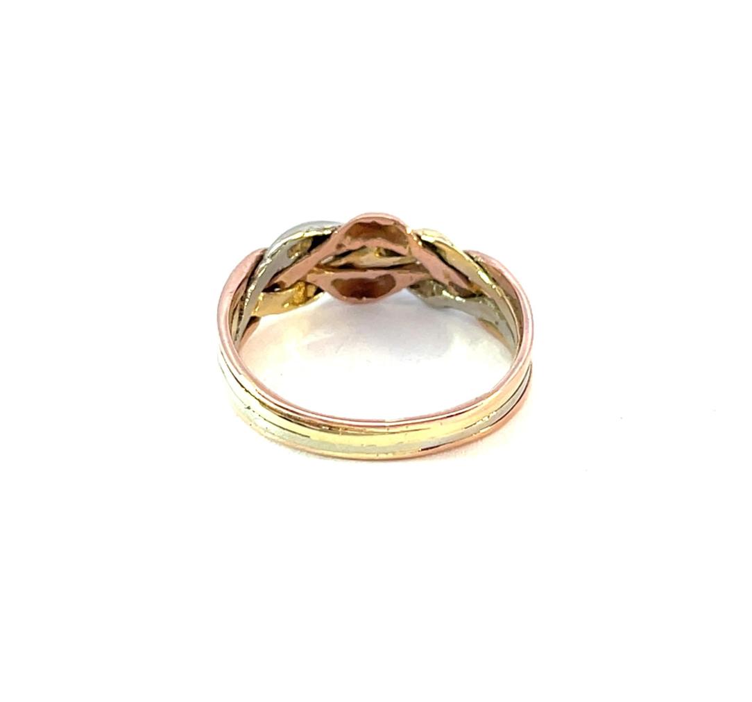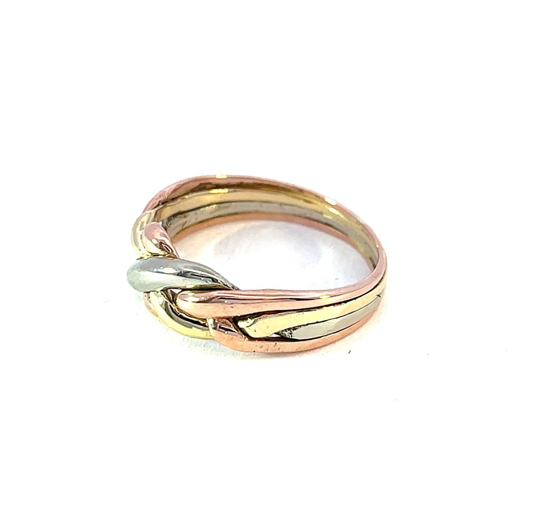 Prsten z kombinace žlutého, růžového a bílého zlata o ryzosti 585/1000, punc labuť. váha 4,06 g, velikost 59, v nejširším bodě 8 mm.