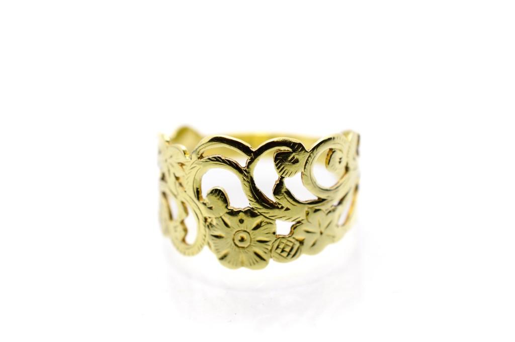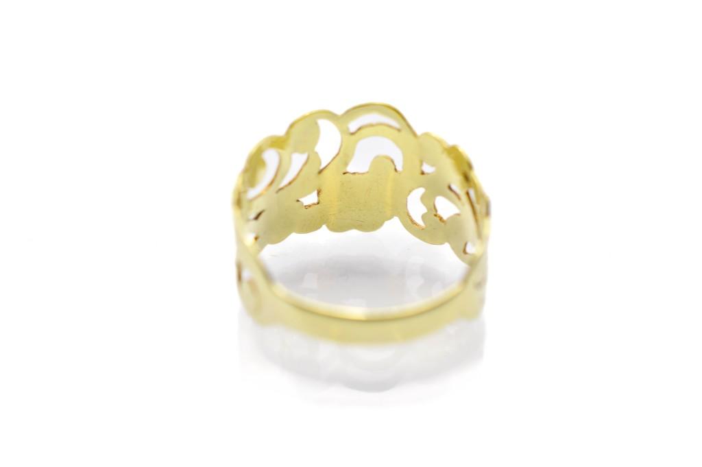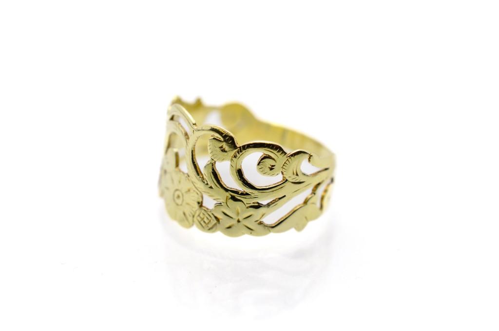 Zlatý prsten, vel. 59, ryzost 585/1000, punc labuť. Váha 2,80 g, v nejširším bodě 13 mm.