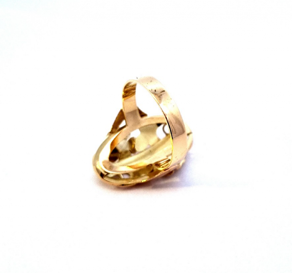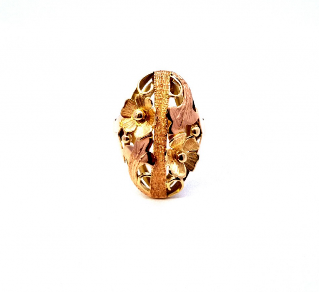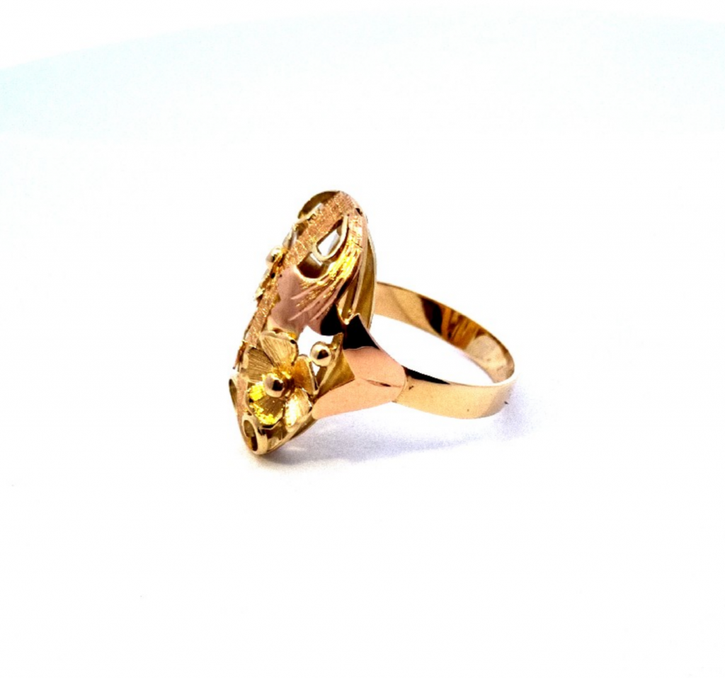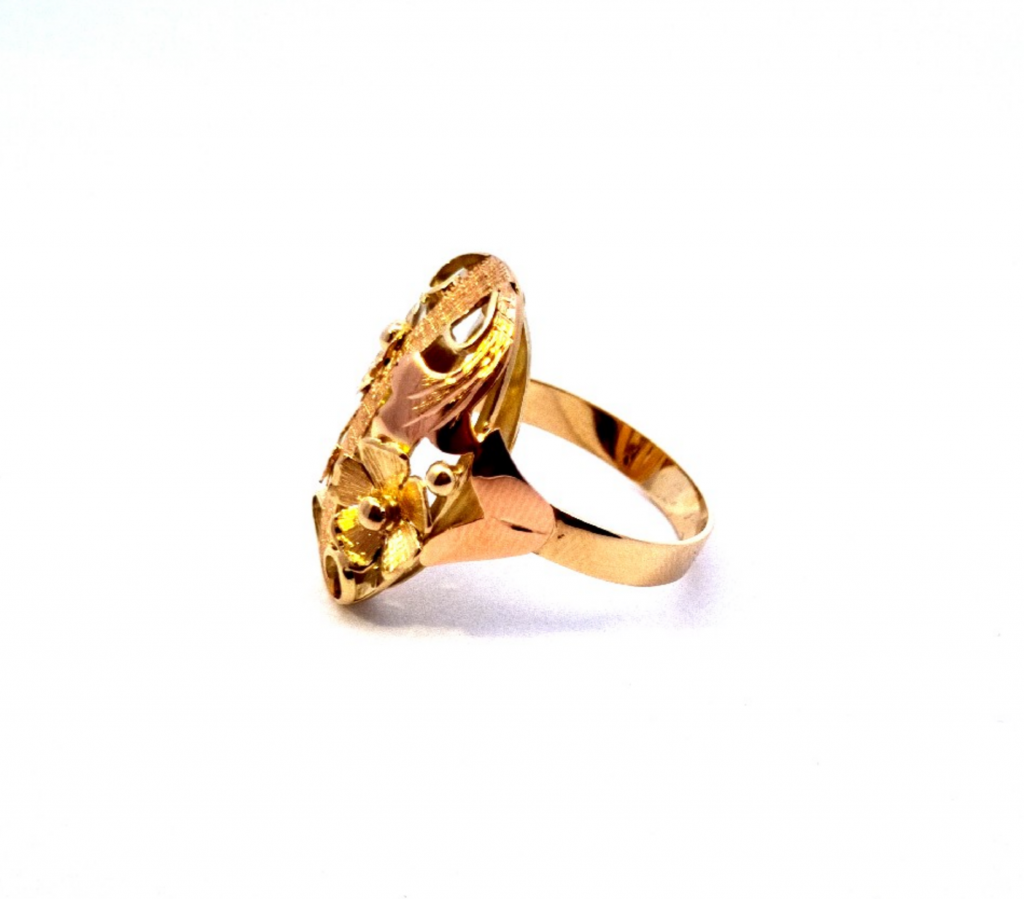 Prsten z kombinace žlutého a růžového zlata o ryzosti 585/1000, punc labuť. Velikost 60, váha 5,15 g, rozměr hlavy prstenu 25 x 16 mm.