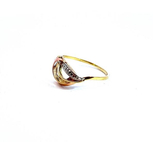 Prsten z kombinace bílého, žlutého a růžového zlata o ryzosti 585/1000, punc labuť. Velikost 60, váha 2,20 g, v nejširším bodě 10 mm.