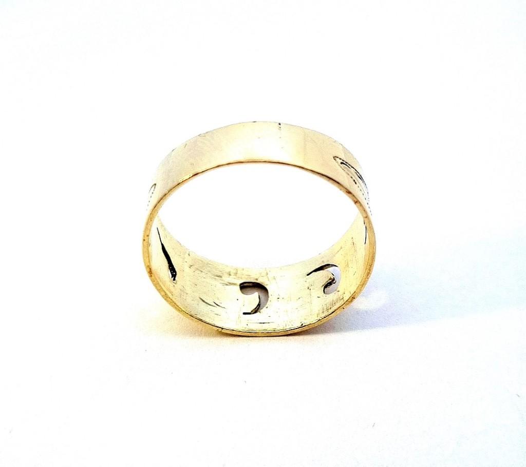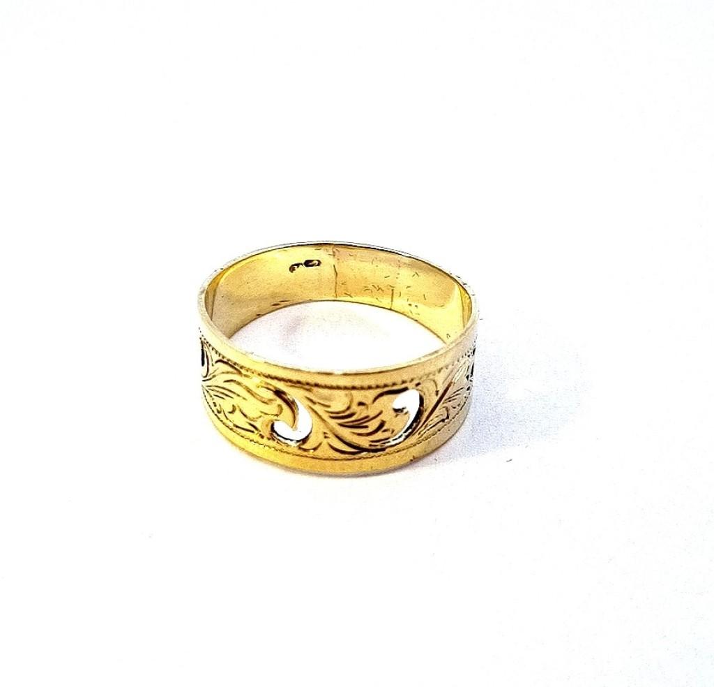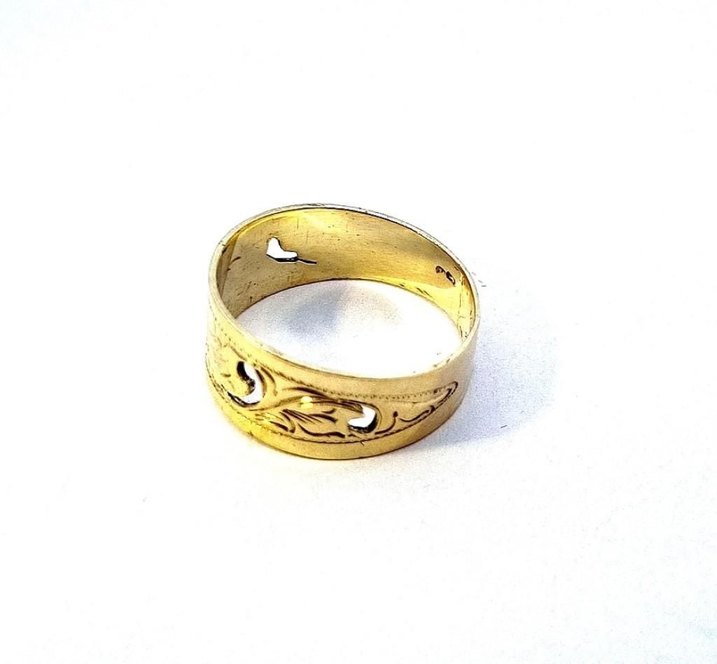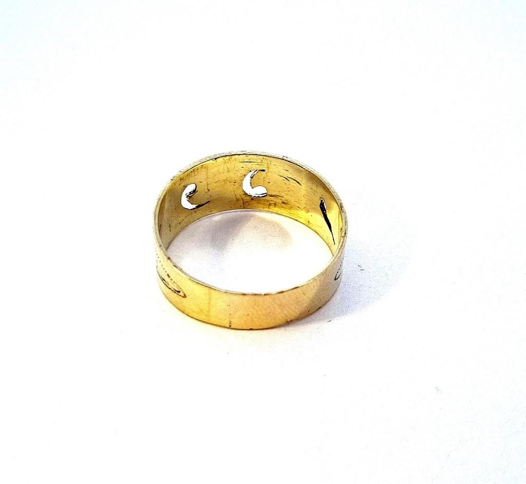 Zlatý prsten o ryzosti 585/1000, punc labuť, váha 4,06 g. V nejširším bodě 9 mm.