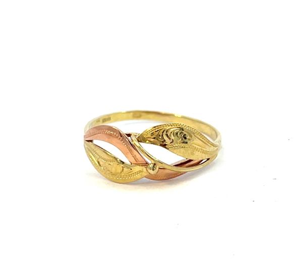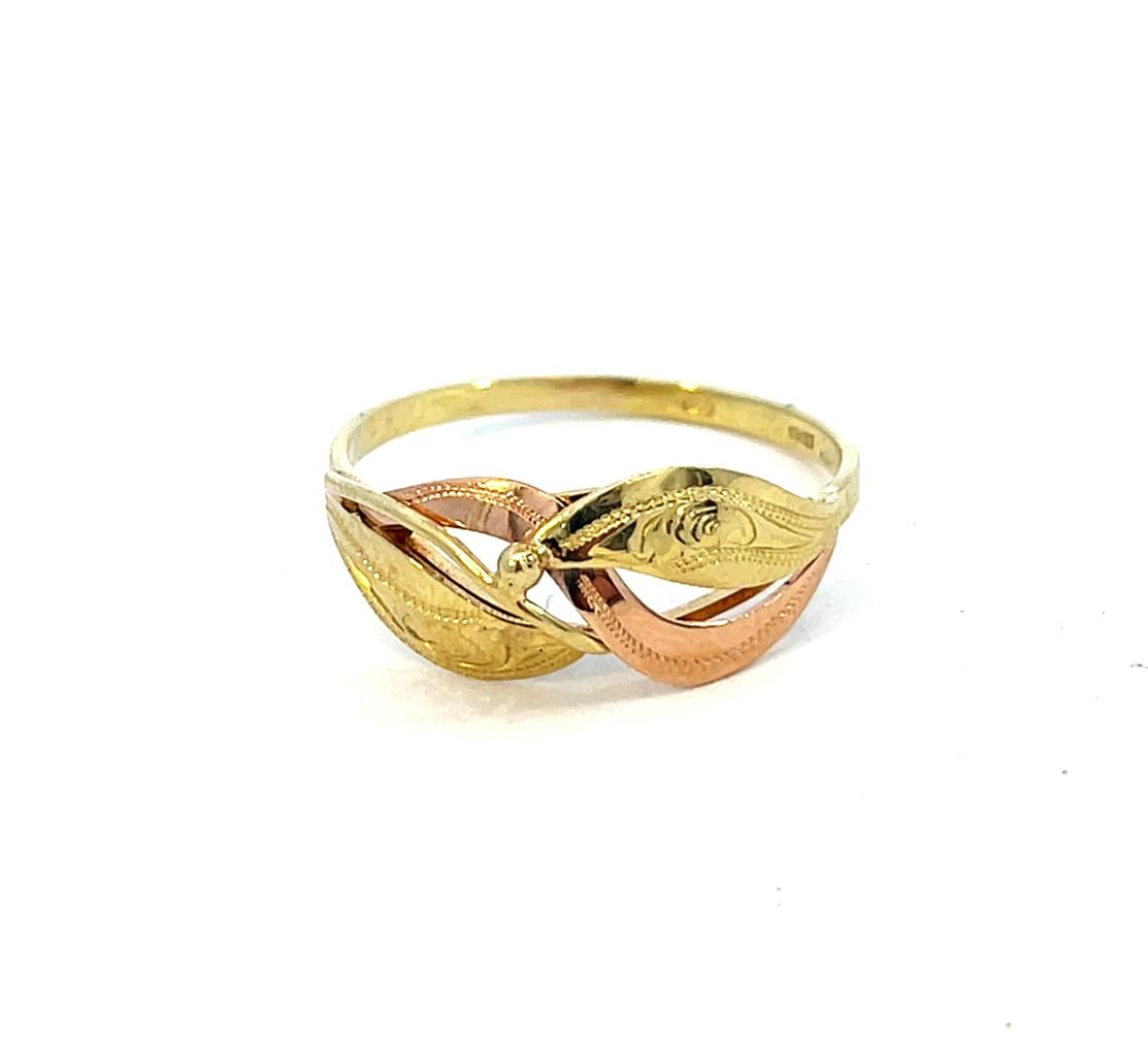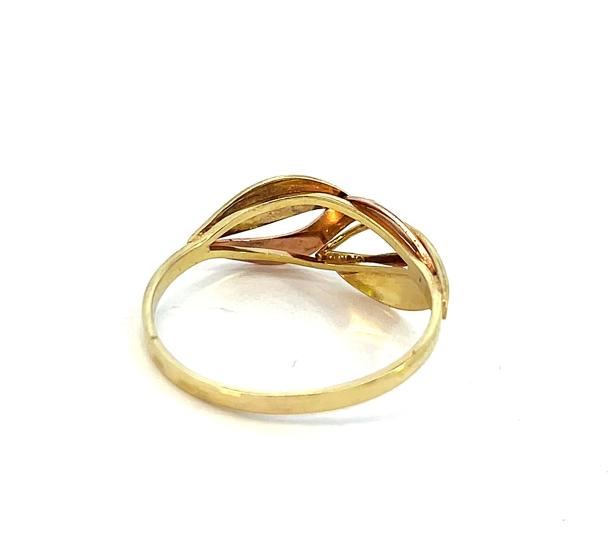 Zlatý prsten v kombinaci žlutého a růžového zlata o ryzosti 585/1000, punc labuť. Váha 2,06 g, velikost 61, v nejširším bodě 9 mm.