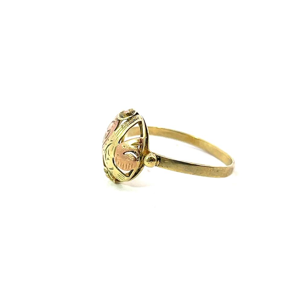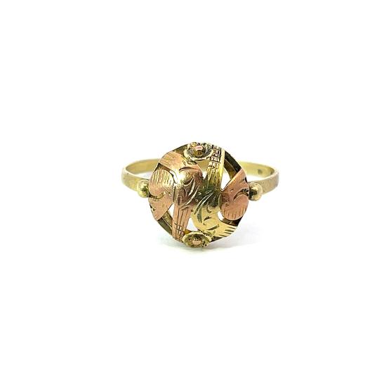 Prsten z kombinace žlutého a růžového zlata o ryzosti 585/1000, punc labuť. Velikost 62, váha 2,47 g, průměr ozdobné části 14 mm.