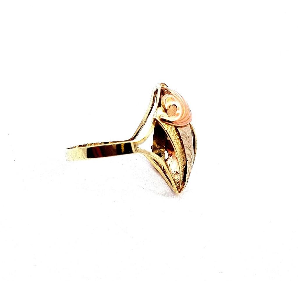 Zlatý prsten o ryzosti 585/1000, punc labuť , váha 4,19 g, velikost 63, v nejširším bodě 24 mm.