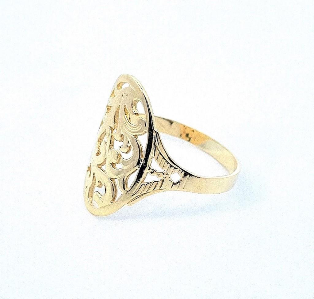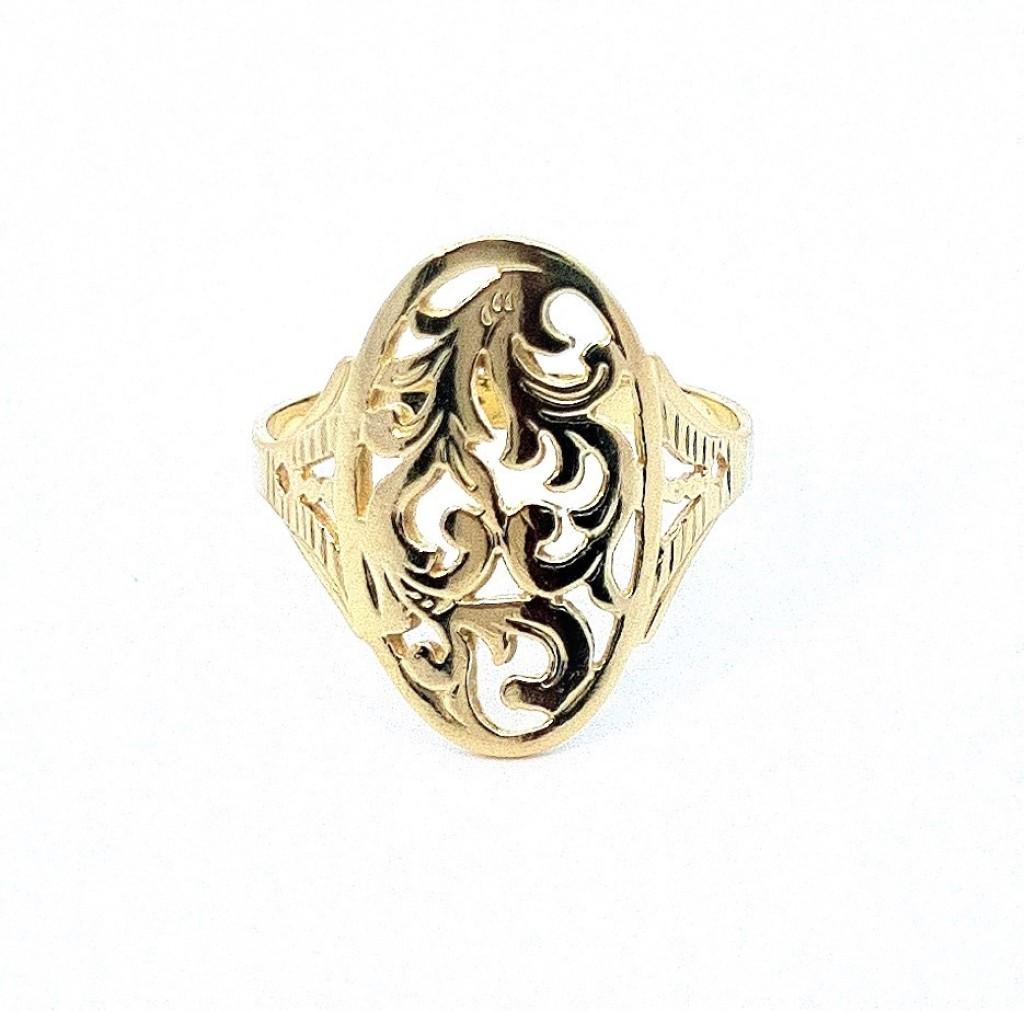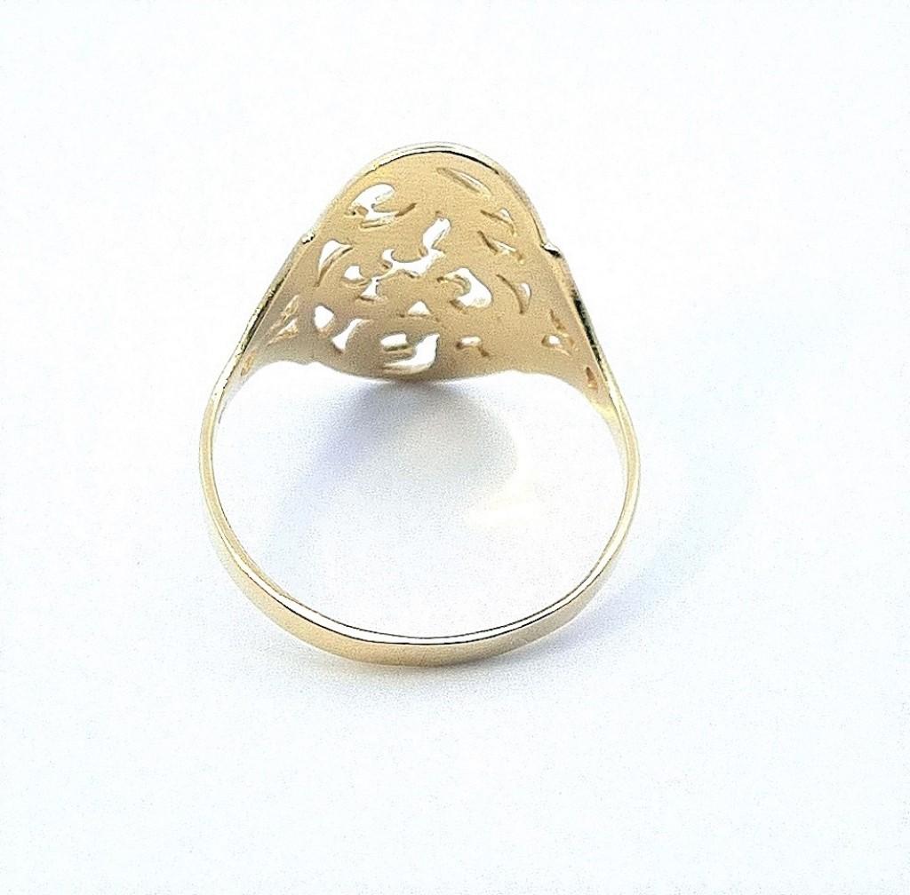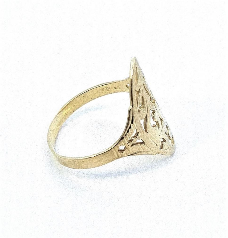 Zlatý prsten o ryzosti 585/1000, punc labuť, váha 3,23 g, velikost 63, v nejširším bodě 22 mm.