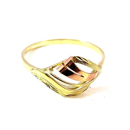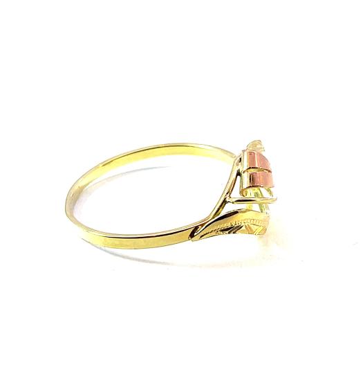 Prsten z kombinace žlutého a růžového zlata o ryzosti 585/1000, punc labuť. Velikost 68, váha 2,35 g, v nejširším bodě 11 mm.