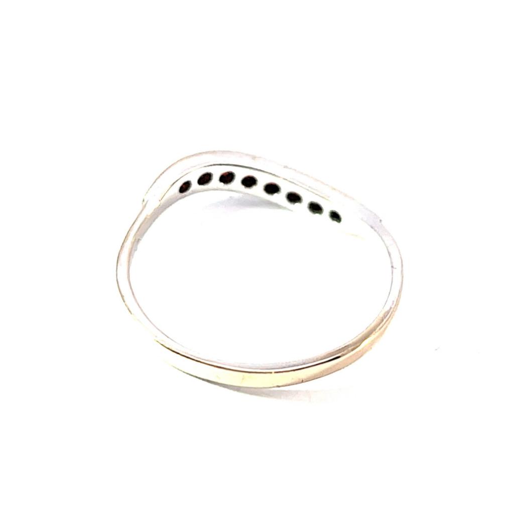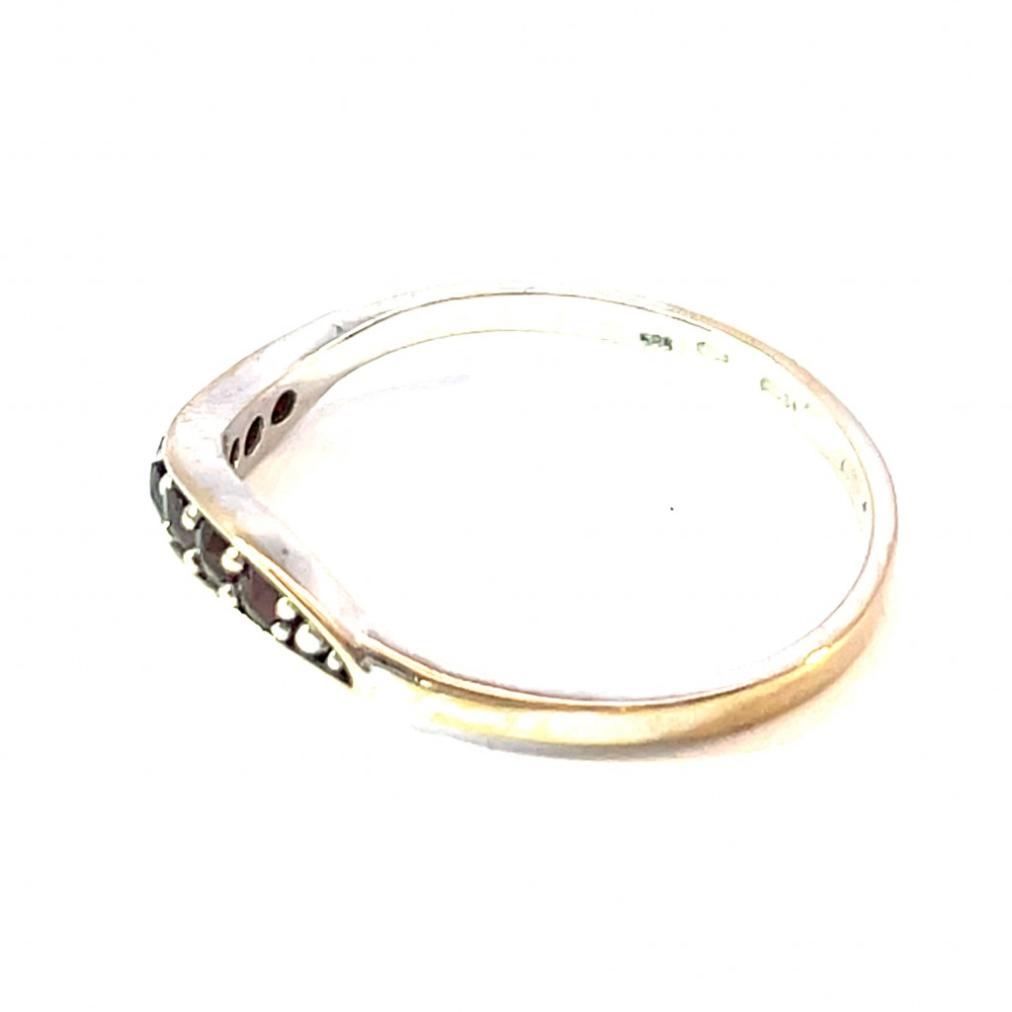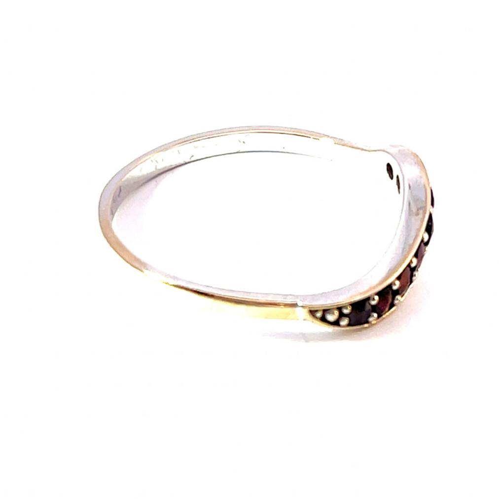 Zlatý prsten z bílého zlata o ryzosti 585/1000 s puncem labuť vykládaný granáty. Celková váha je 1,86 g, velikost 60,5. V nejširší části měří 3 mm. Průměr kamenů je 2 mm.