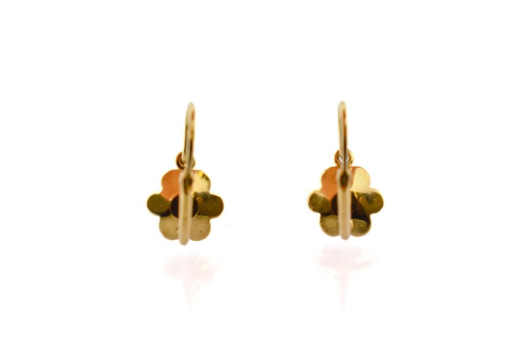 Zlaté dětské náušnice o ryzosti 585/1000, punc lvíček, váha 1,26 g, výška celkem 12 mm, šířka v nejširším bodě 7 mm. Kámen je syntetický.
