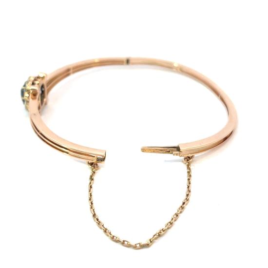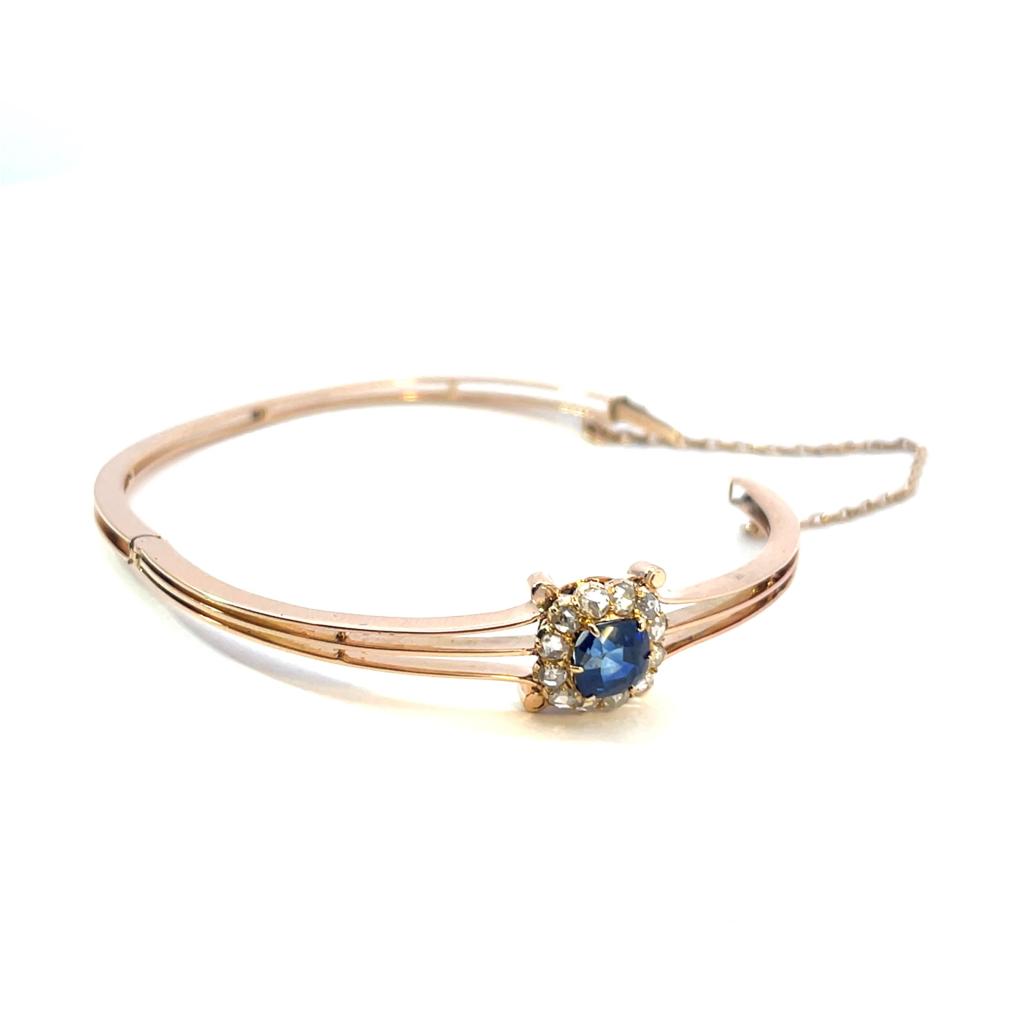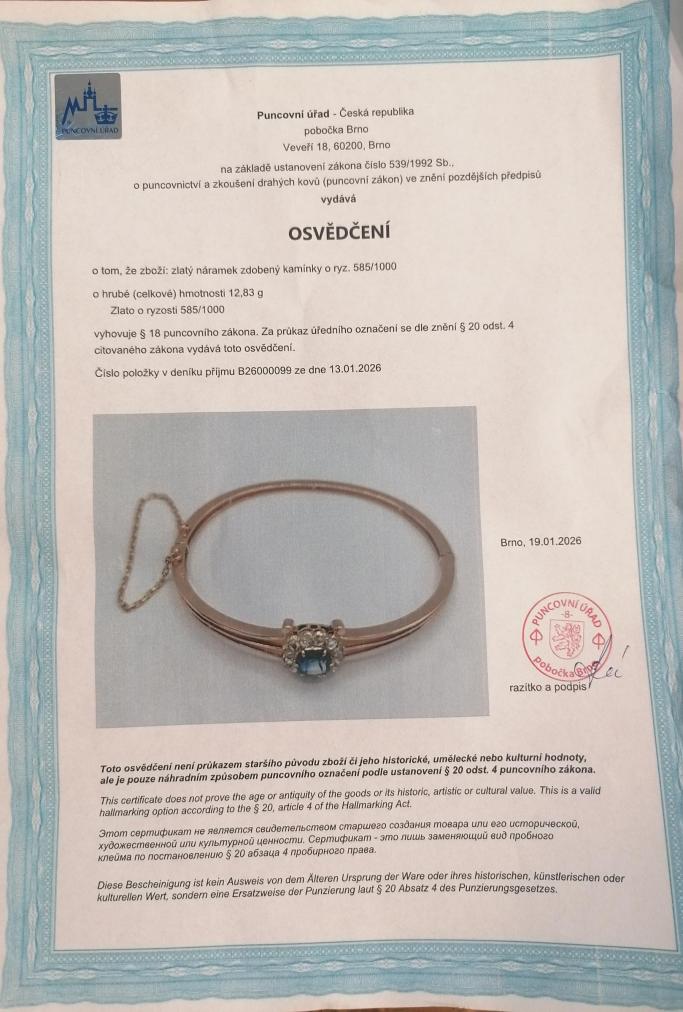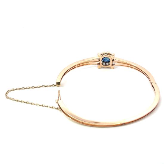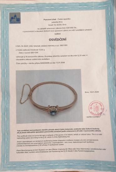 Náramek z růžového zlata o ryzosti 585/1000, osvědčení z PÚ. Váha 12,83 g, vnitřní průměr 55 mm, po obvodu cca 17,5 cm (+/- pár milimetrů, vzhledem k charakteru náramku nelze délku změřit přesně), v nejširším bodě 12 mm. Kámen - syntetický safír - 1 ks. Kámen - přírodní diamant routa - 11 ks.