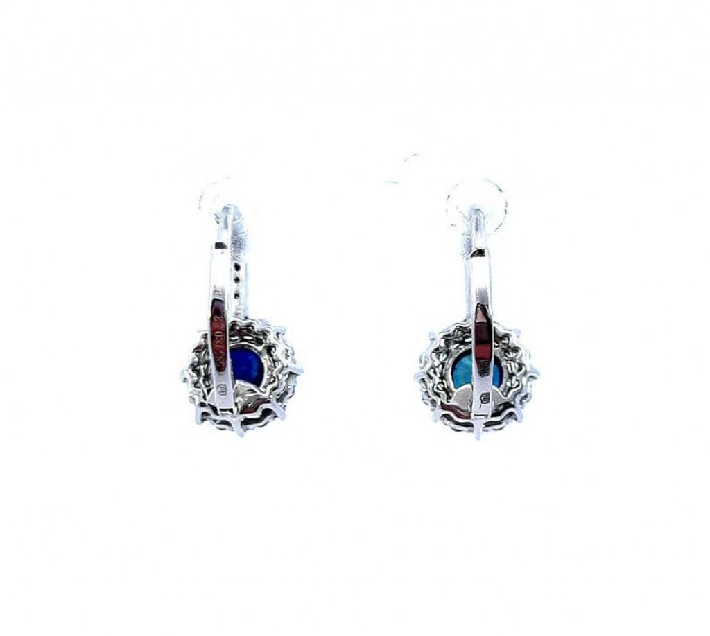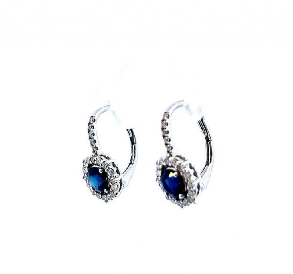 Zlaté náušnice o ryzosti 585/1000, punc labuť, váha 2,16 g , na výšku 15 mm, v nejširším bodě 9 mm, kámen - diamant celkem cca - 0,32 ct, safíry cca 0,97 ct.