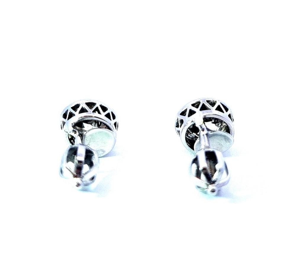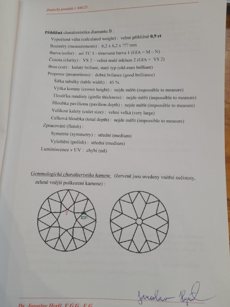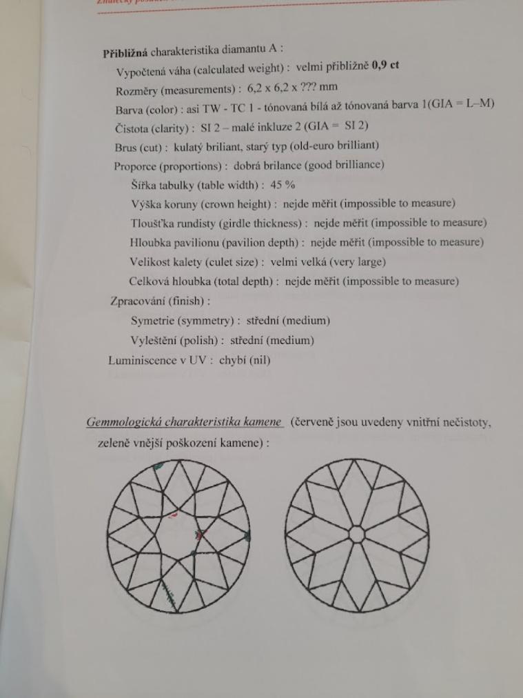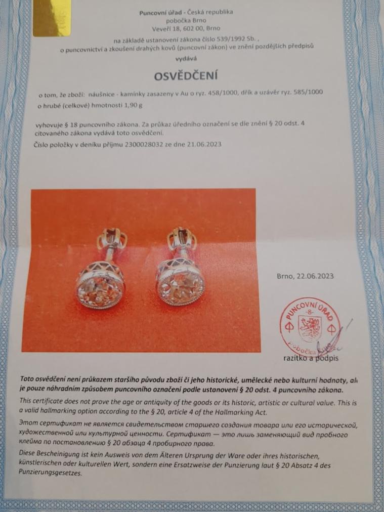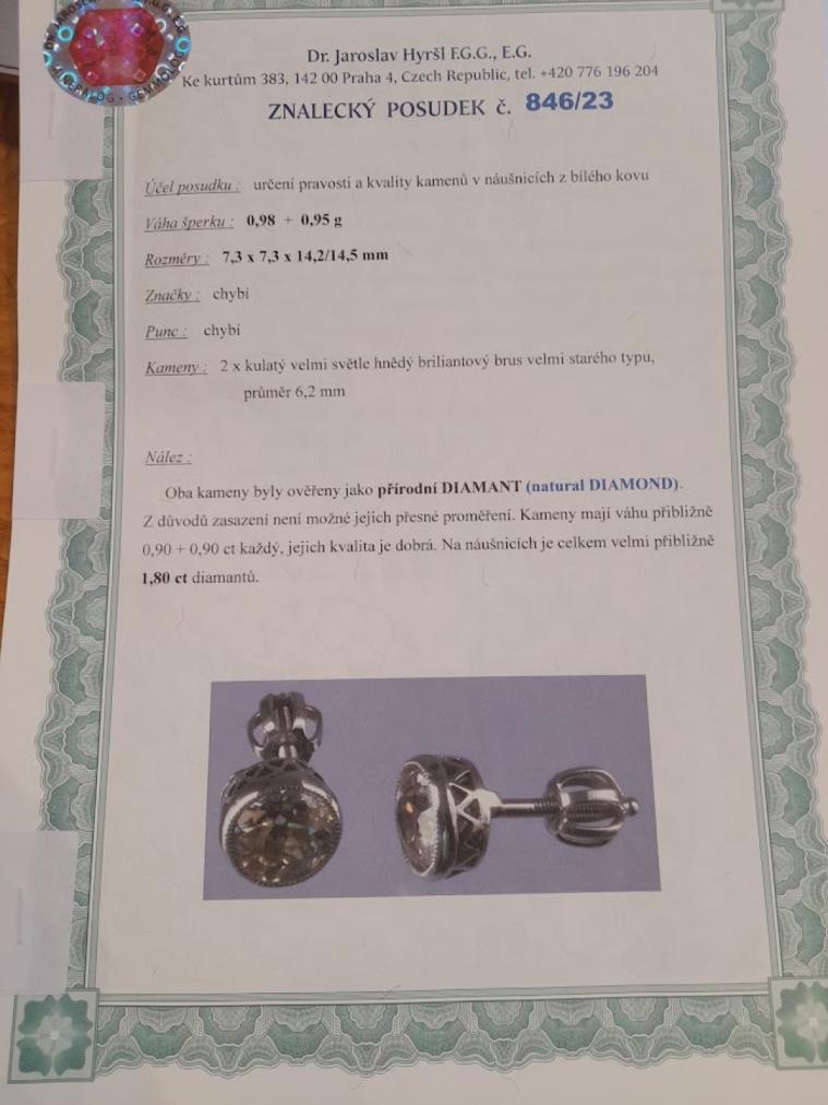 Zlaté náušnice o ryzosti 585/1000, kameny zasazeny ve zlatě o ryzosti 458/1000, osvědčení z puncovního úřadu, váha 1,92 g, výška celkem 7 mm. Kámen - diamant staroevropský brus - 2 ks, 2 x cca 0,9 ct. Znalecký posudek ke kamenům.