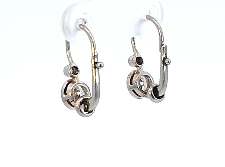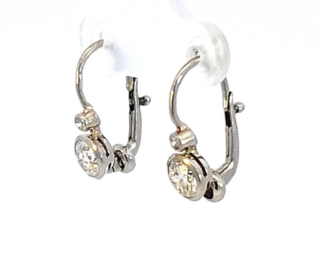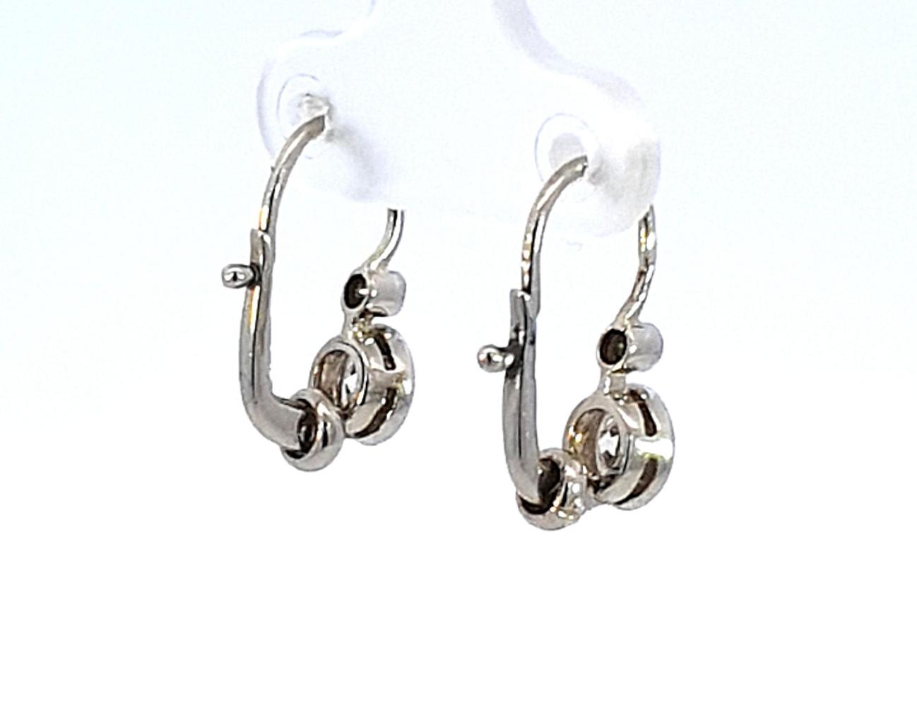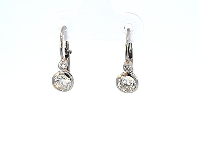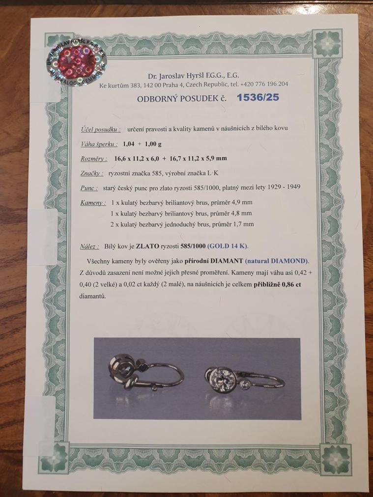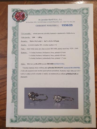 Náušnice z bílého zlata o ryzosti 585/1000, punc lvíček. Váha 2,05 g, výška 17 mm, v nejširším bodě 6 mm. Kámen - přírodní diamant briliantového brusu - 2 ks, přírodní diamant jednoduchého brusu, centrální kameny: 2 ks, cca 0,42 ct +0,40 ct, vrchní kameny: 2 ks, cca 0,02 ct každý - dohromady cca 0,86 ct - viz odborný posudek. Na náušnicích jsou pojistné kroužky.