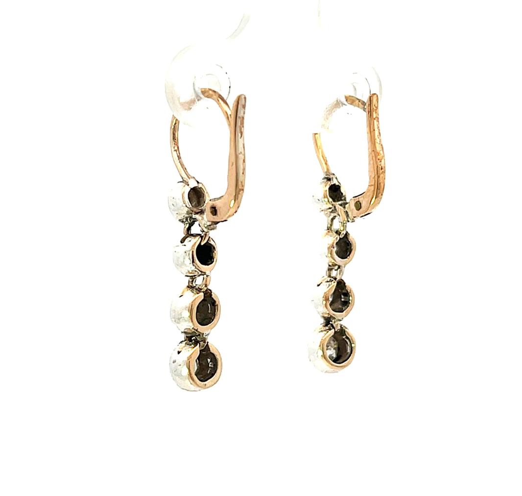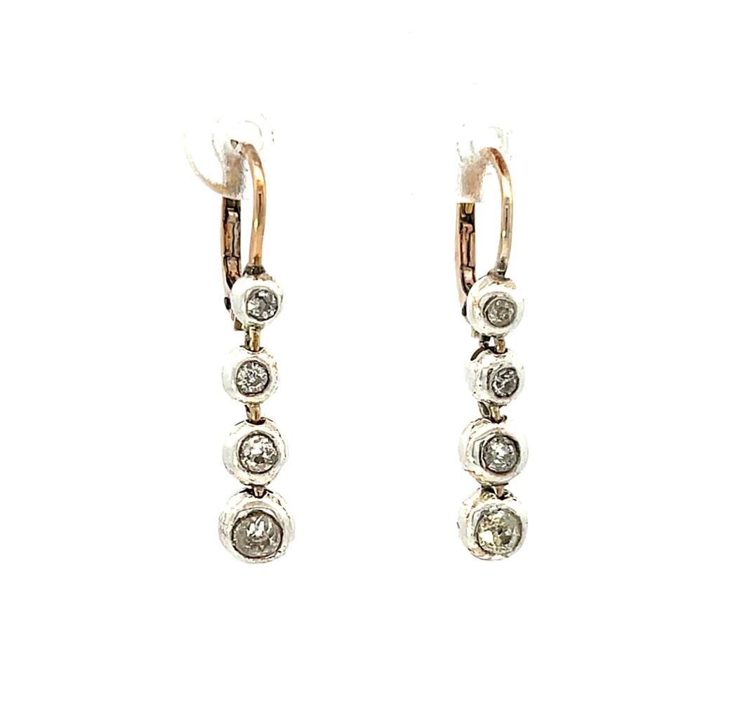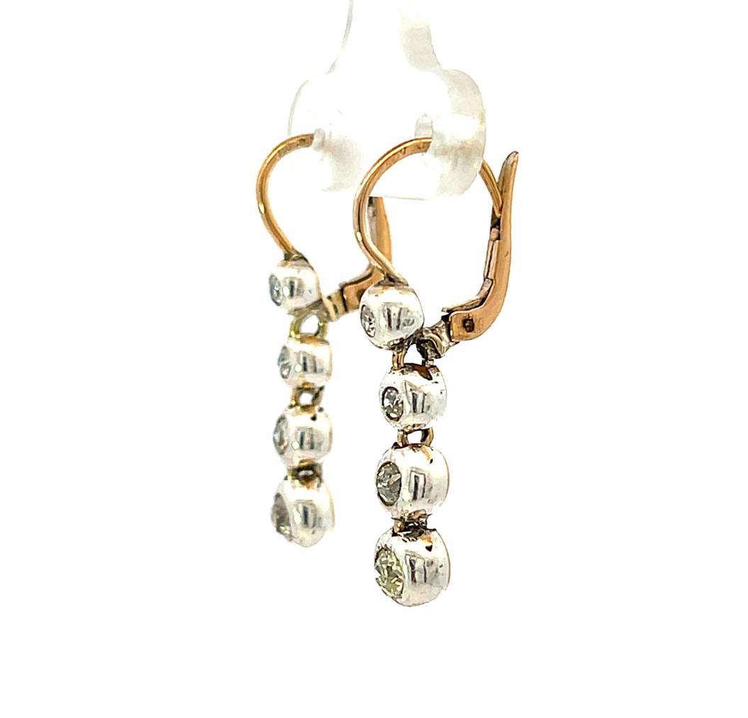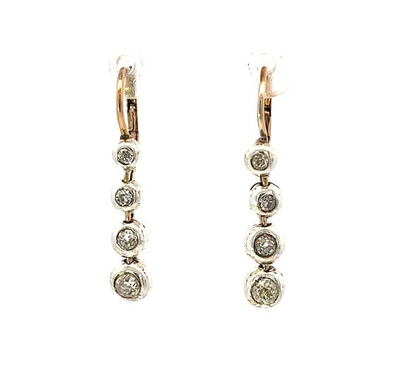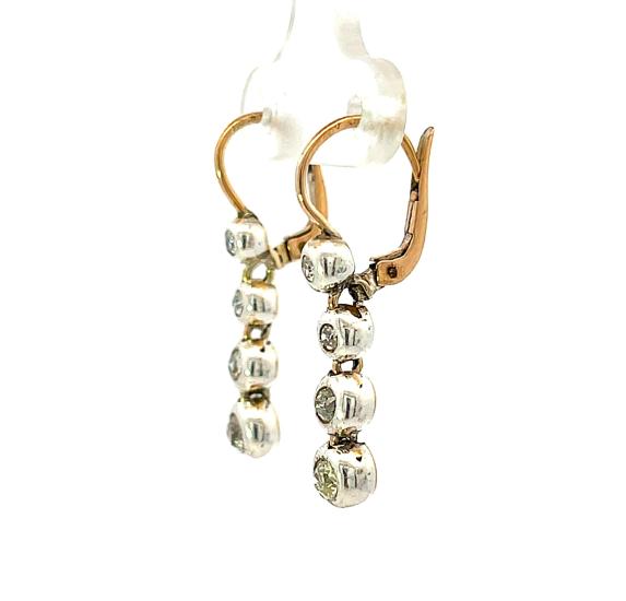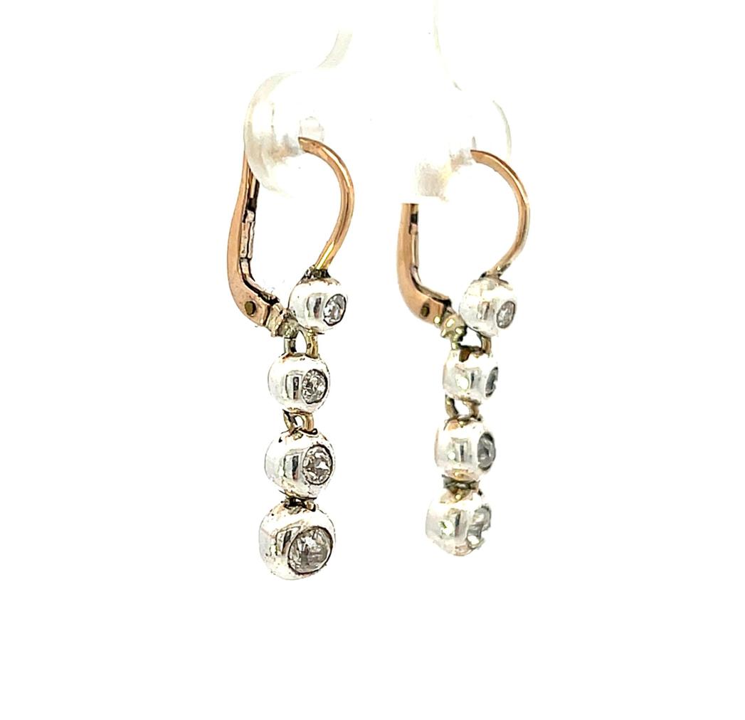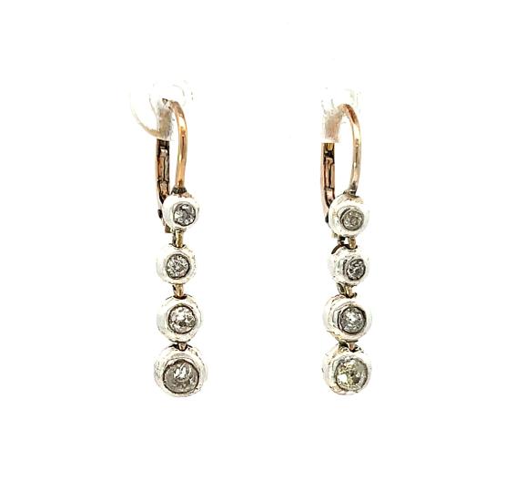 Zlaté náušnice z kombinace zlata o ryzosti 580/1000, punc liška a labuť (1 ks dopuncován) a stříbra (zasazení kamenů). Váha 3,53 g, výška 27 mm, v nejširším bodě 5 mm. Kámen - přírodní diamant staroevropského brusu - 8 ks, největší kameny: 2 ks, cca 0,10 ct každý, menší kameny: 6 ks, dohromady cca 0,38 ct - celkem je na náušnicích cca 0,58 ct.