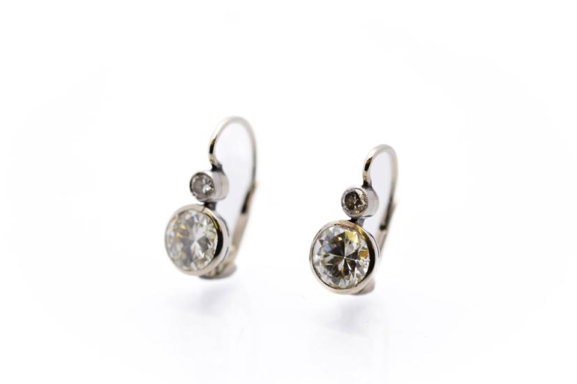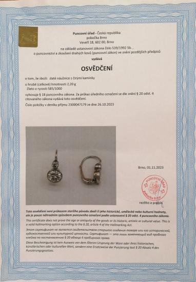 Zlaté náušnice o ryzosti 585/1000, osvědčení z Puncovního úřadu. Váha 2,20 g, výška 17 mm, šířka v nejširším bodě 7 mm. Kámen větší - přírodní diamant briliantového brusu - celkem 2 ks. Diamant A: cca 0,90 ct, barva: TC, čistota: VS 2. Diamant B: 0,87 ct, barva: TC 1, čistota: VVS 2. Menší kameny - diamant briliantového brusu - celkem 2 ks, cca 0,07 ct každý. Dohromady cca 1,91 ct.