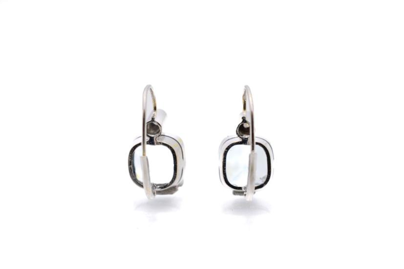 Zlaté náušnice s akvamaríny a diamanty, visací, ryzost 585/1000, punc labuť, váha 6,49g, celková výška 21,5 mm, šířka v nejširším bodě 11 mm. Kameny jsou přírodní akvamaríny, antik portugalský brus, celkem cca 8,6 ct , diamanty briliantového brusu, celkem cca 0,14 ct.