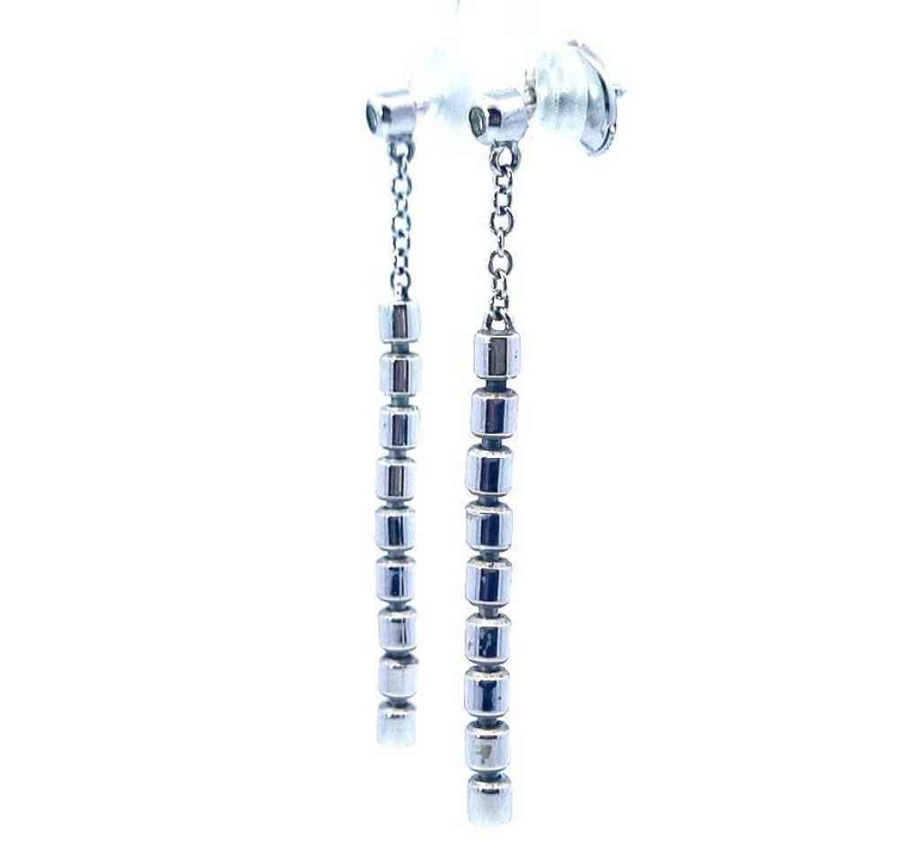 Zlaté náušnice, originál Piaget, z bílého zlata o ryzosti 750/1000, punc kohout. Váha 5,50 g, výška 49 mm, šířka 3 mm. Kámen - přírodní diamant briliantového brusu - celkem 2 ks, barva: D - G, čistota: IF - VVS2, cca 0,05 ct každý - dohromady cca 0,10 ct.