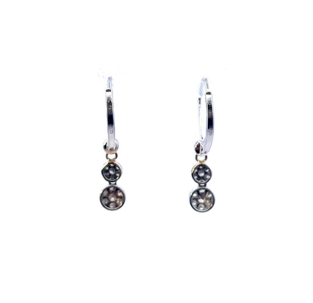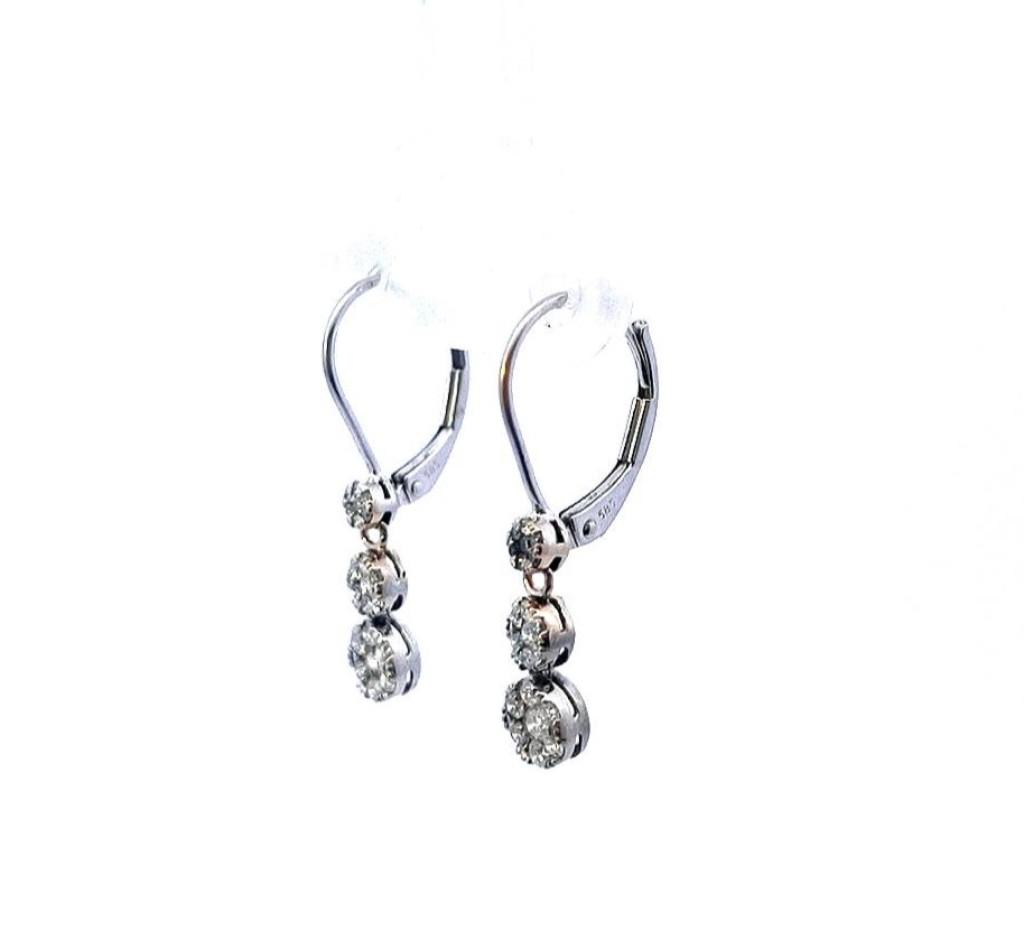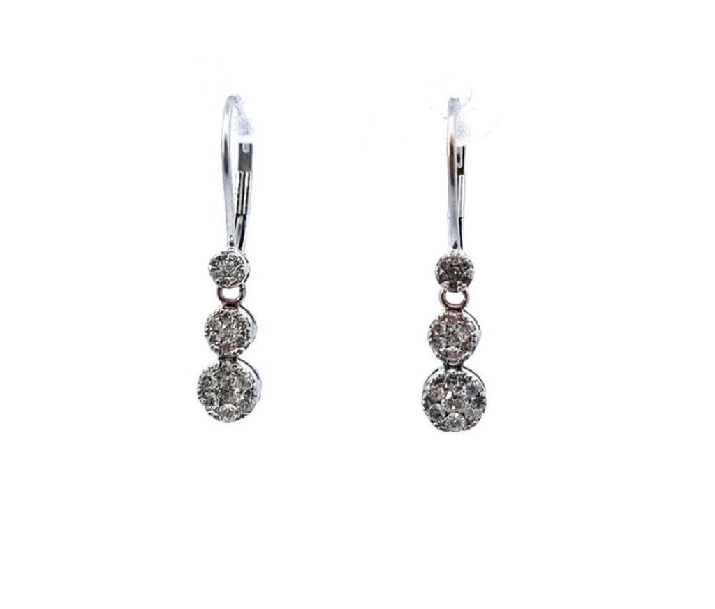 Zlaté náušnice o ryzosti 585/1000, punc labuť. Váha 1,56 g, výška 25 mm, v nejširším bodě 5 mm. Kámen - přírodní diamant briliantového brusu - celkem 21 ks každá náušnice, dohromady cca 0,32 ct.