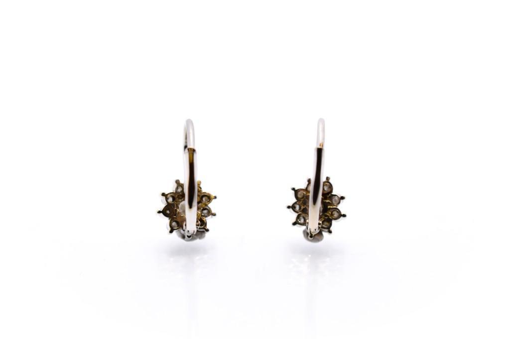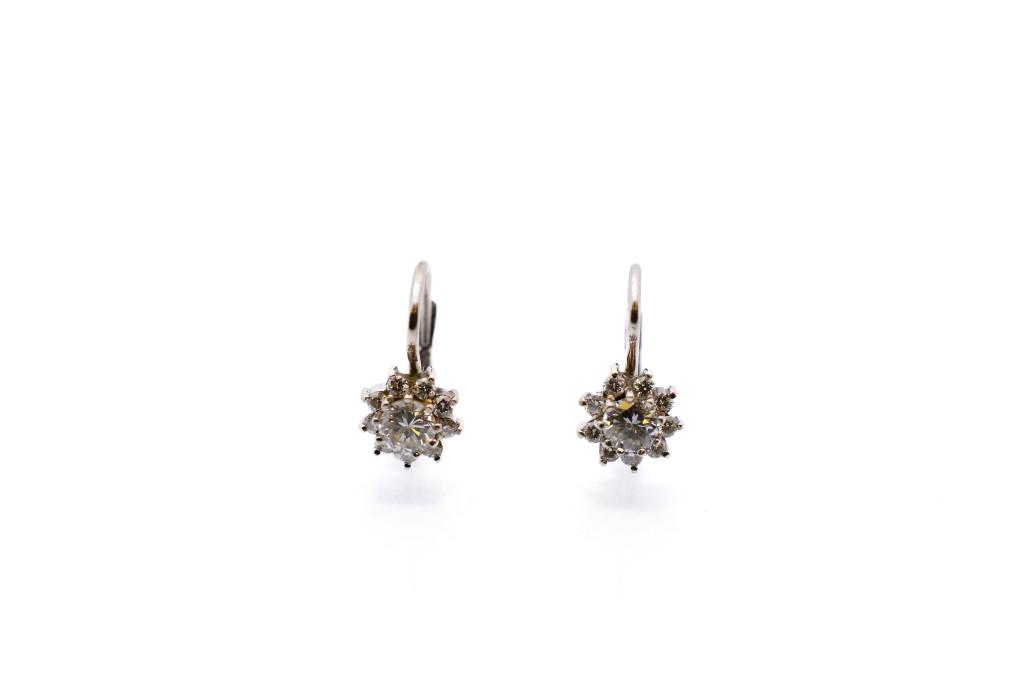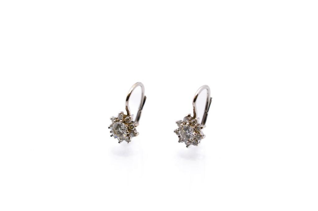 Zlaté náušnice z bílého zlata o ryzosti 585/1000, punc labuť. Váha 2,58 g, výška 11 mm, šířka v nejširším bodě 8 mm. Kámen - diamant briliantového brusu - větší centrální kameny: celkem 2 ks, cca 0,25 ct každý. Menší kameny: celkem 18 ks, cca 0,01 ct každý. Dohromady cca 0,68 ct.