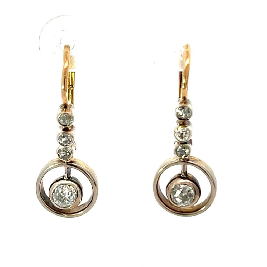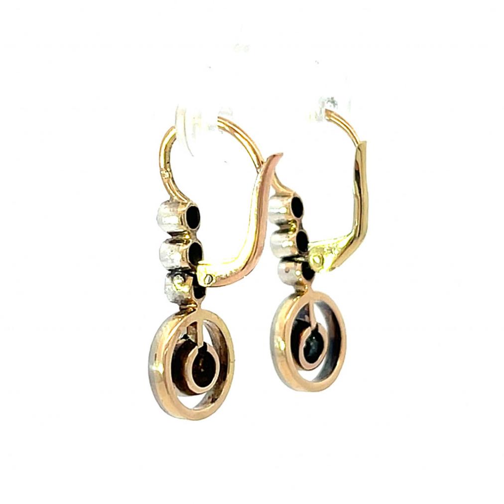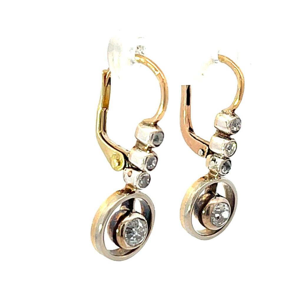 Starožitné zlaté náušnice - nově opuncované o ryzosti 585/1000, punc labuť, kameny zasazeny do stříbra o ryzosti 959/1000, punc kamzík. Váha 3,70 g, výška 26 mm, v nejširším bodě 9,5 mm. Kámen - přírodní diamant staroevropského brusu - 7 ks, největší kameny: 2 ks, cca 0,20 ct každý, menší kameny: 5 ks, cca 0,05 ct každý. Dohromady cca 0,65 ct. Jeden kamínek je nahrazený diamantovou routou.