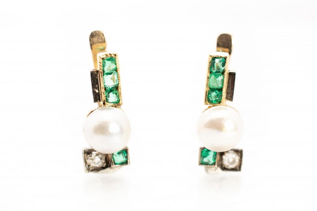 Zlaté náušnice o ryzosti 585/1000, osvědčení z PÚ, váha 3,71g , na výšku 21 mm, průměr perly 7 mm, kámen - diamant, staro - evropský brus, cca2 x 0,08 ct, 8 x smaragd cca 0,7 ct