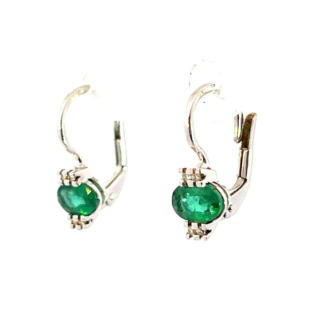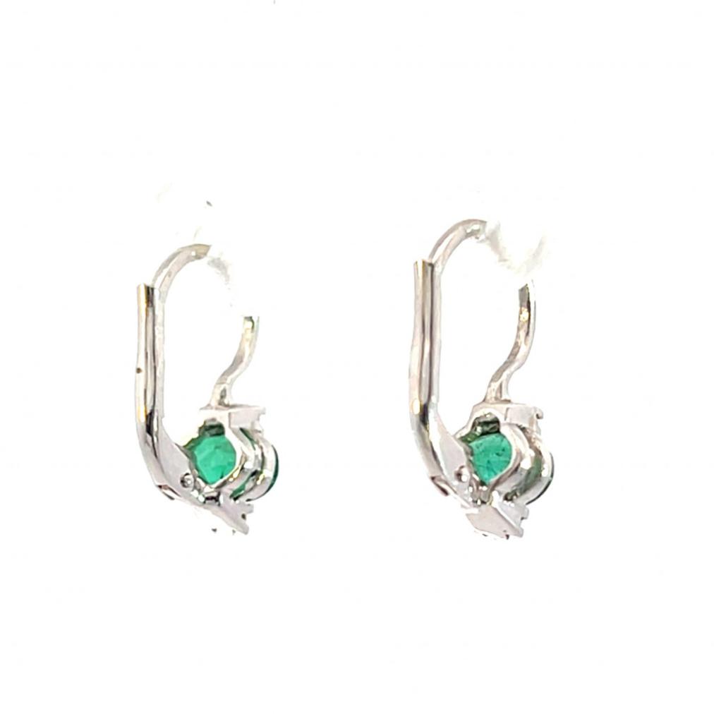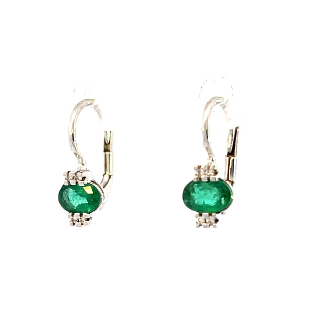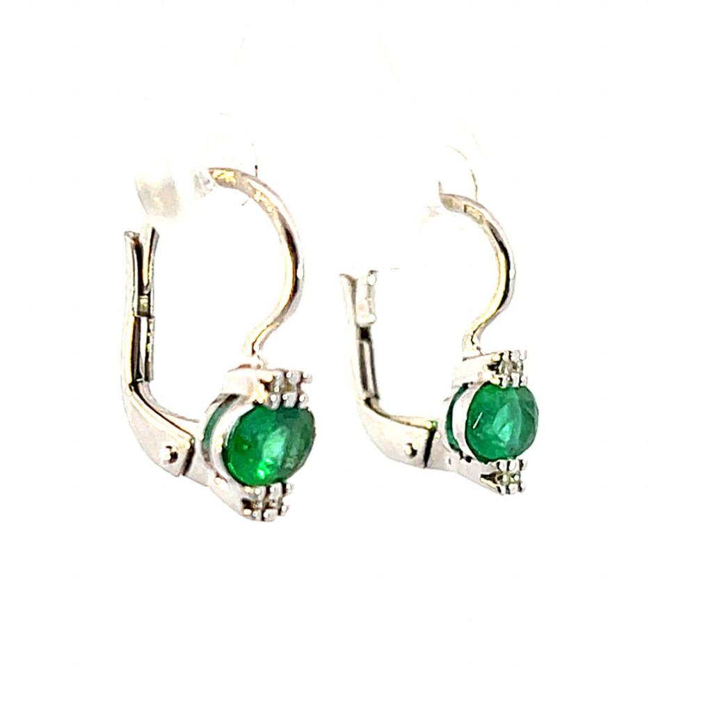 Náušnice z bílého zlata o ryzosti 585/1000, punc labuť. Váha 1,52 g, výška 14 mm, ozdoby v nejširším bodě 6 mm. Kámen - přírodní smaragd - 2 ks. Kámen - přírodní diamant briliantového brusu - 8 ks, cca 0,005 ct každý - dohromady cca 0,04 ct.