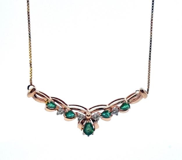 Zlatý kolier s kombinací zlata o ryzosti 585/1000 (přívěs) a 750/1000 (řetízek), osvědčení z Puncovního úřadu. Váha 5,93 g, délka 47 cm, šířka řetízku 1 mm, výška přívěsu 21 mm, šířka 47 mm. Kámen - diamant briliantového brusu - 15 ks, cca 0,15 ct + smaragdy.
