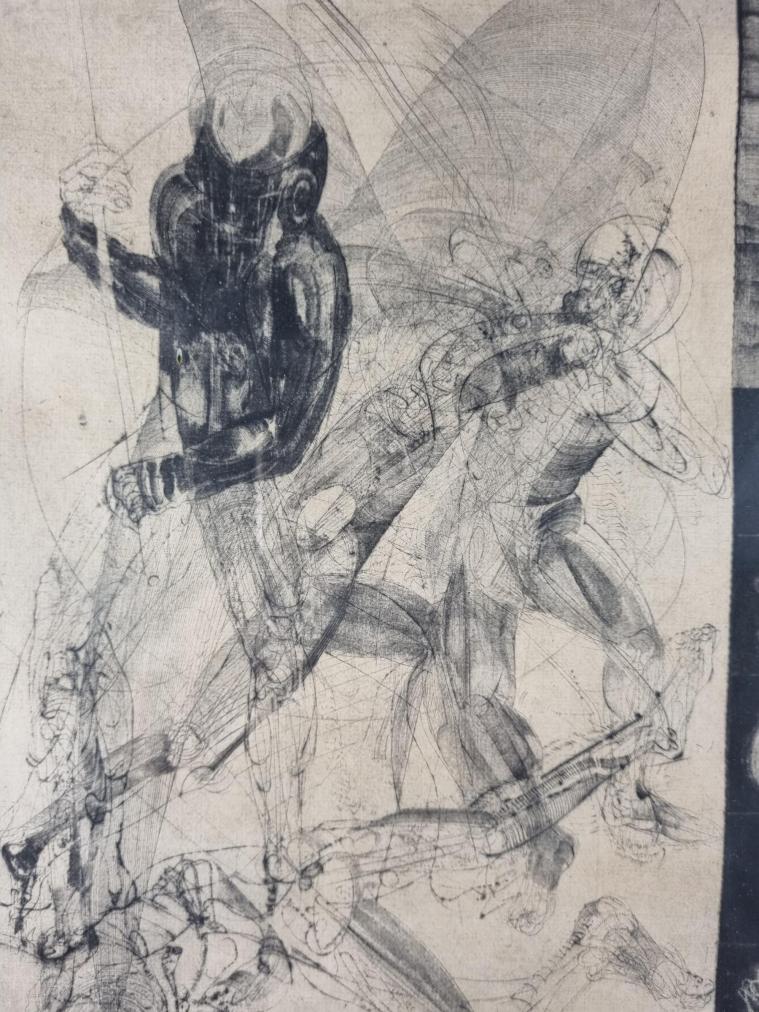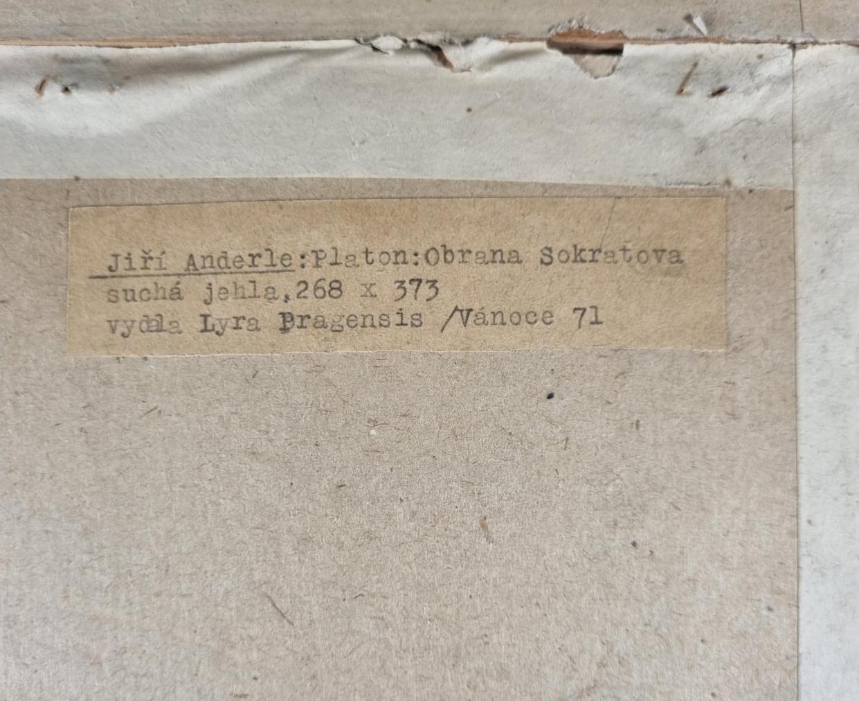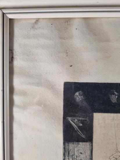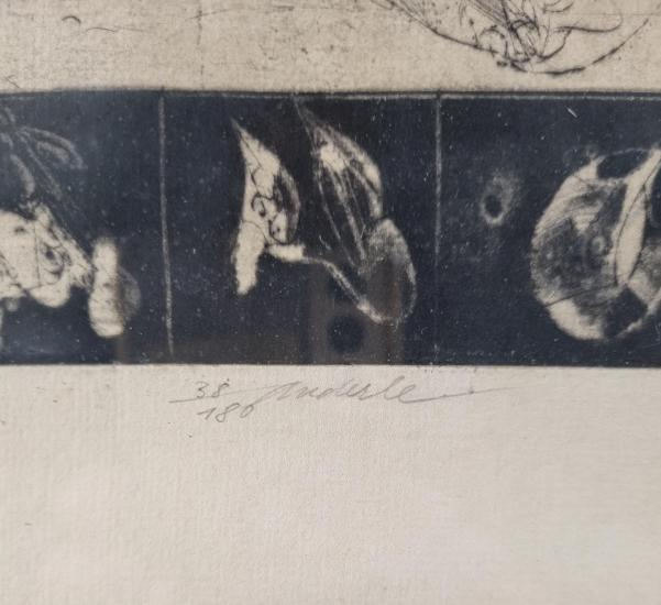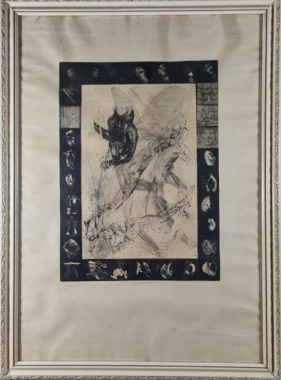 Úžasná grafika od jednoho z předních výtvarníku Jiřího Anderleho. V tomto díle pracuje zajímavě s formální stránkou obrazu, centrální výjev rámuje menšími fragmenty tváře v temně černém pozadí. Pro Anderleho je typické, že do jednoho díla zaznamenává dynamický motiv v různých fázích, a tak pracuje s překrýváním a vrstvením motivů, čímž vzniká v díle hloubka. Suchá jehla na papíře pod sklem, rozměry s rámem 64 x 47 cm, rozměry díla 26 x 36 cm. Signováno dole uprostřed, "výtisk 38/180 Anderle". Vzadu autorský štítek.